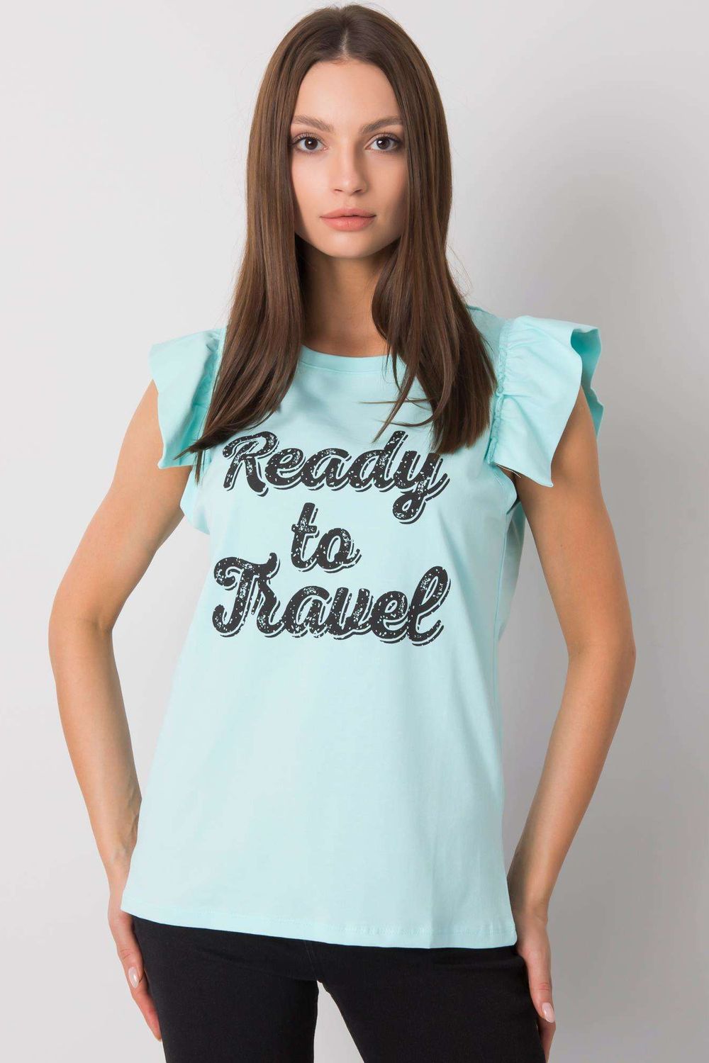 Blouse with short sleeves in the form of a frill and a round neckline. A decorative inscription on the front.