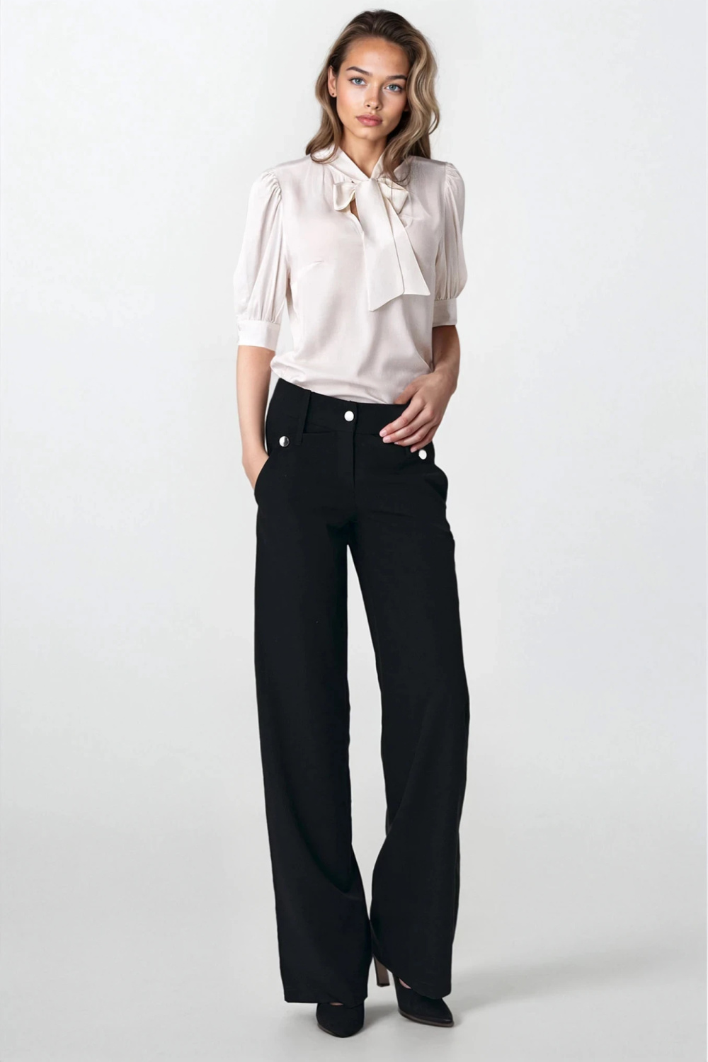 The elegant blouse with a tie at the neckline is the perfect accent in soft-office stylizations.