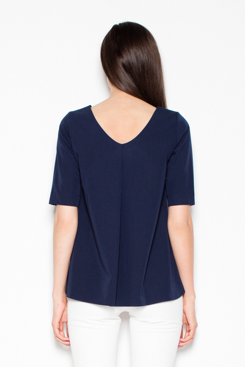 Elegant short sleeve blouse with asymmetrical cut. It features a cut-out at the back which beautifully emphasizes the back. Blouse goes well with matching trousers.