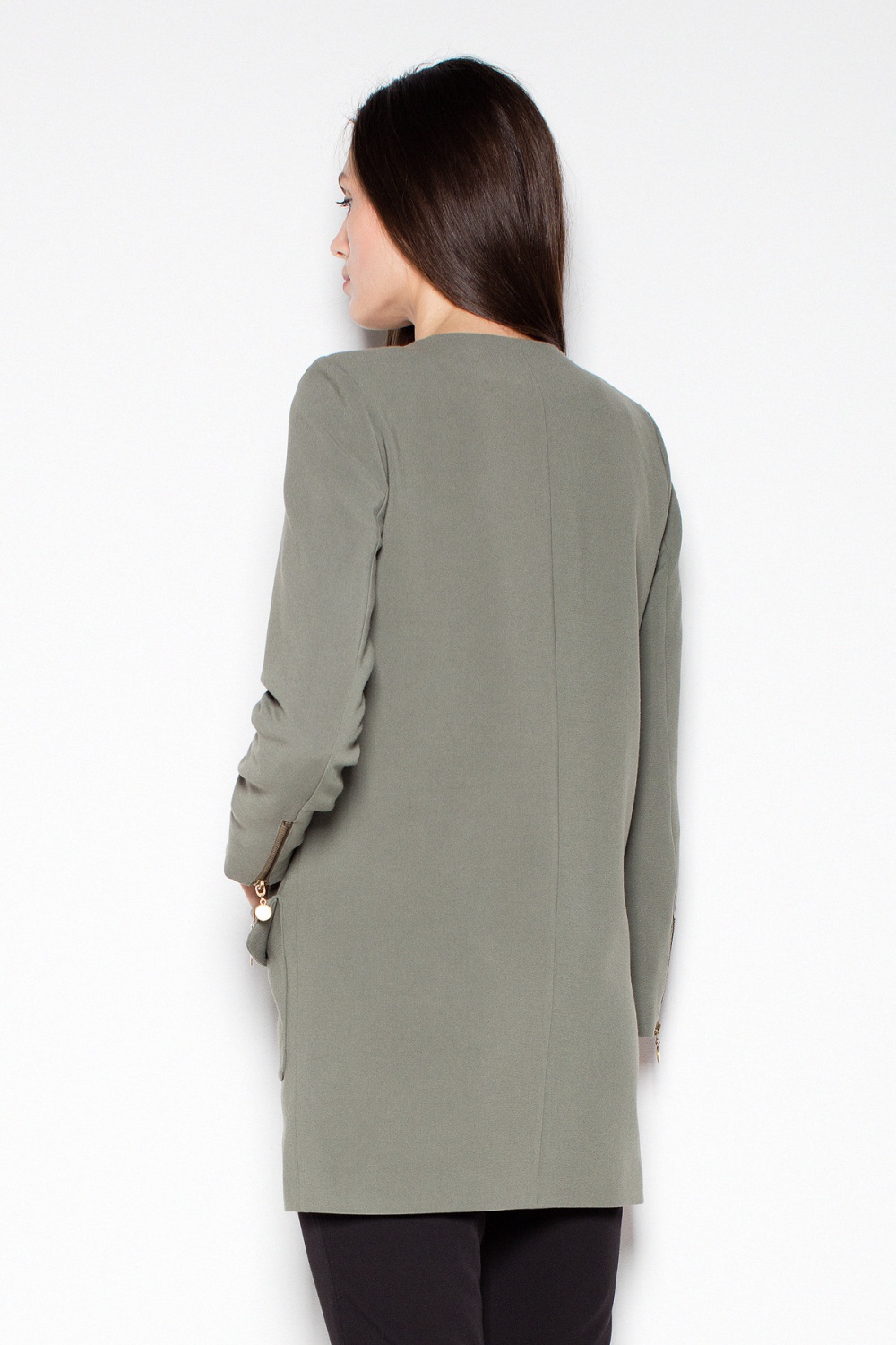 Straight cut, zipped coat finished with decorative pockets and a striking slit at the zipper.