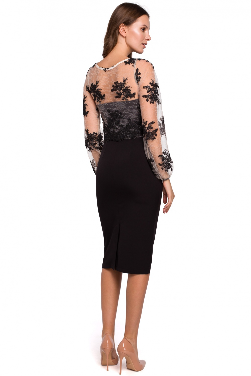 A beautiful dress consisting of two layers. The bottom is made of smooth fabric, with a heart neckline and pencil bottom is the essence of elegance. The top sewn from guipure with buffet sleeves gives it an original character. Dress is fastened with a covered zipper. This model can accompany you to many parties.
