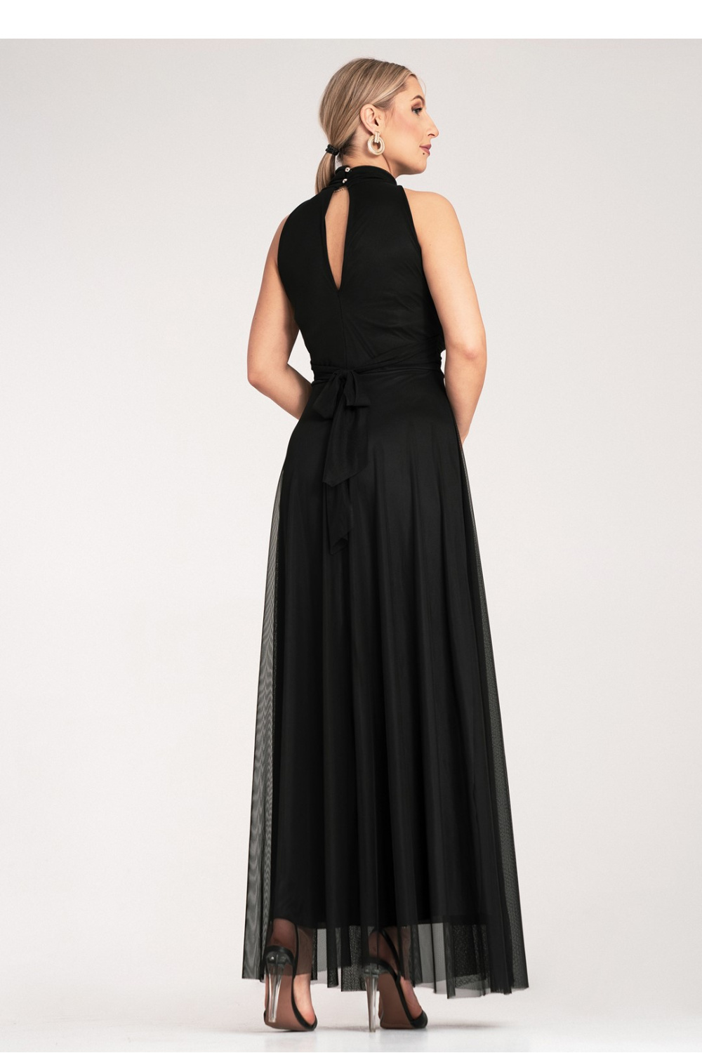 Maxi dress with a halter neckline that emphasizes the shape of the neck and shoulders.