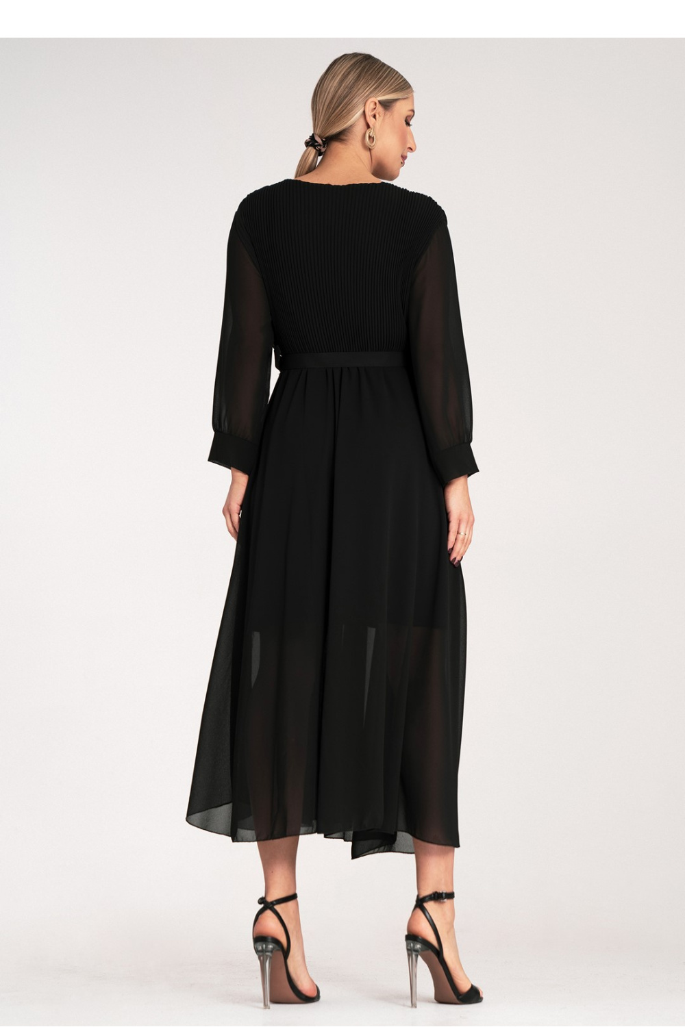 Maxi dress with pleated, wrap neckline. Long sleeve with cuff, belt at the waist.