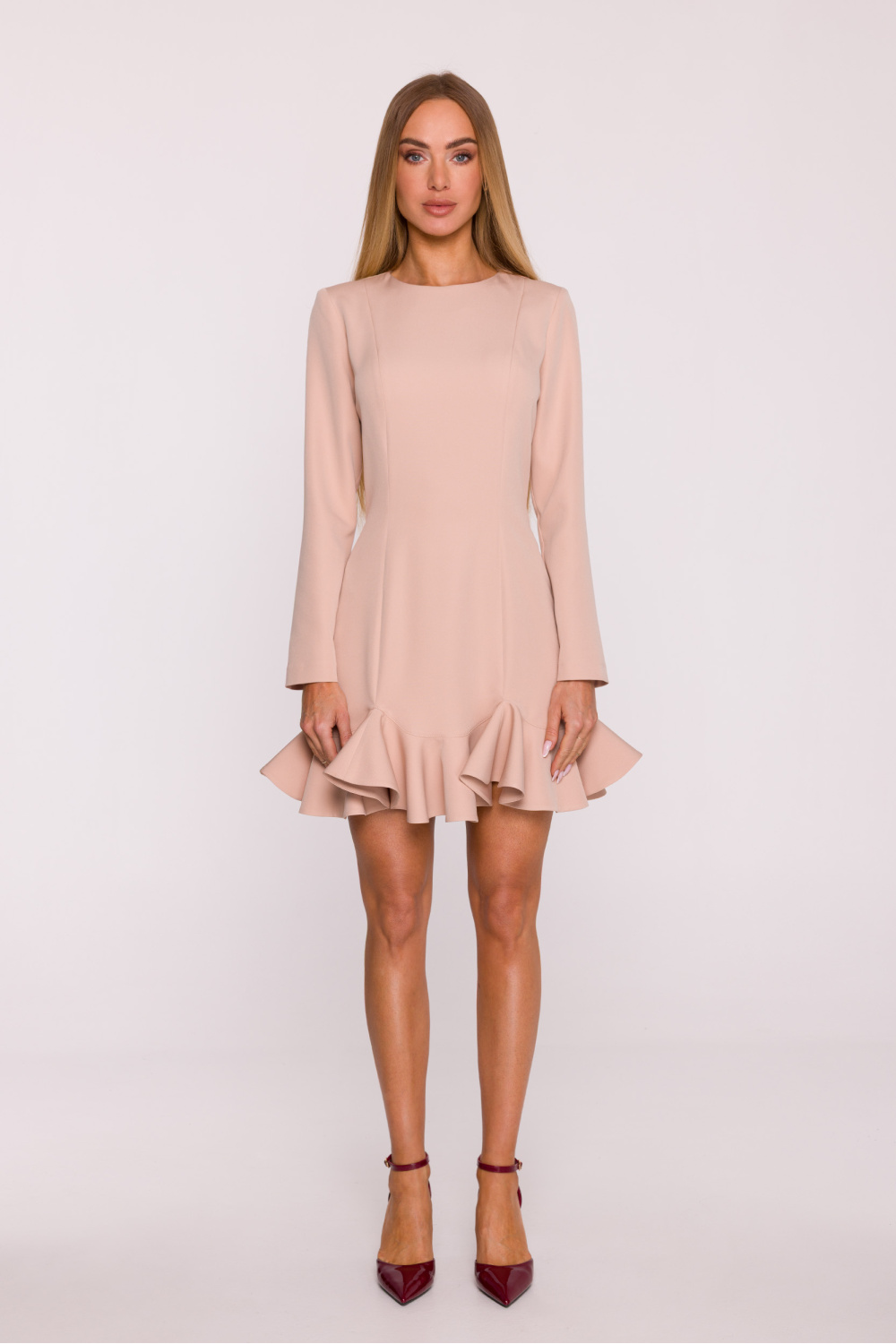 The subtle and feminine dress made of smooth fabric with a matte finish is a perfect choice for many occasions. The simple form has been enriched with a fancy ruffle at the bottom, which gives the whole outfit lightness and girlish charm. The model has a classic, semi-circular neckline and long sleeves, making it look elegant and timeless. The concealed zipper at the back ensures easy dressing and a neat finish. The lack of pockets and lining makes the dress light, comfortable, and beautifully fits the silhouette. The design is intended to subtly emphasize the figure – the top creates a simple, slightly tailored line with shaping seams, and the flared bottom with a ruffle moves beautifully. The mini length adds freshness and a modern character to the outfit. Designed and made in Poland, with women who appreciate simple elegance with a touch of originality in mind.