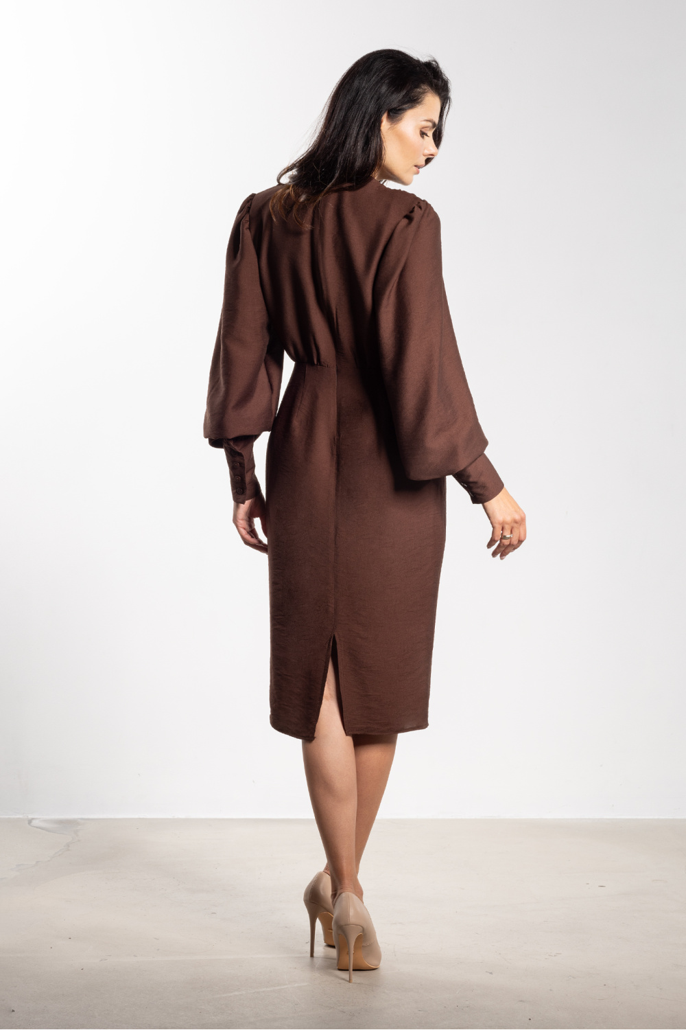 A fitted midi dress is a perfect choice for special occasions. The deep V-neckline accentuates the neck and subtly highlights the bust, giving the outfit a feminine character. Ruching at the waist slims the silhouette, and the pencil skirt guarantees a classic line. Long puffy sleeves with wide cuffs add lightness and elegance, while the knee-length combines class with femininity.