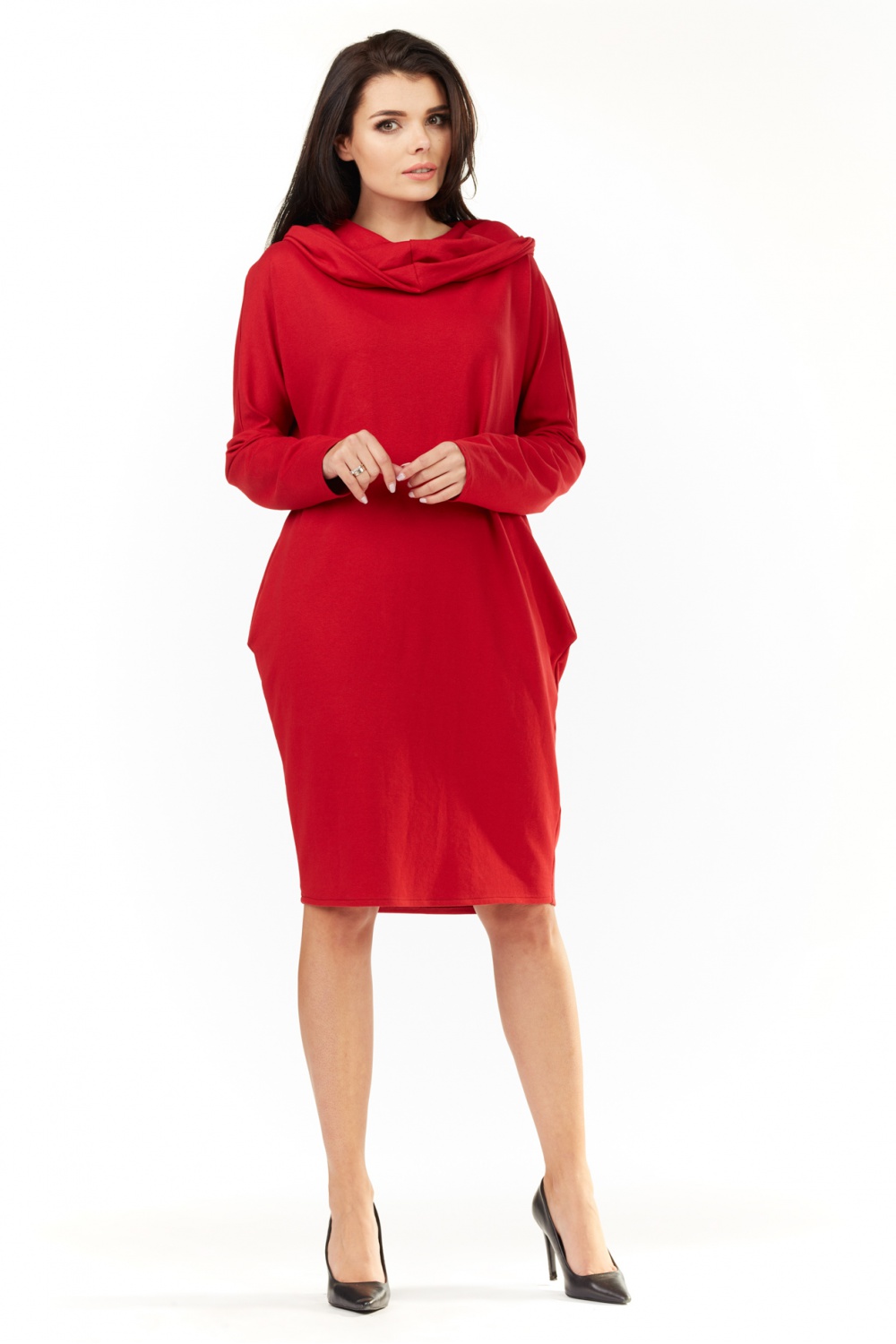 Knitted dress with long sleeves. Dress has a loose cut with a hood. Dress has pockets on sides. Ideal for many occasions.