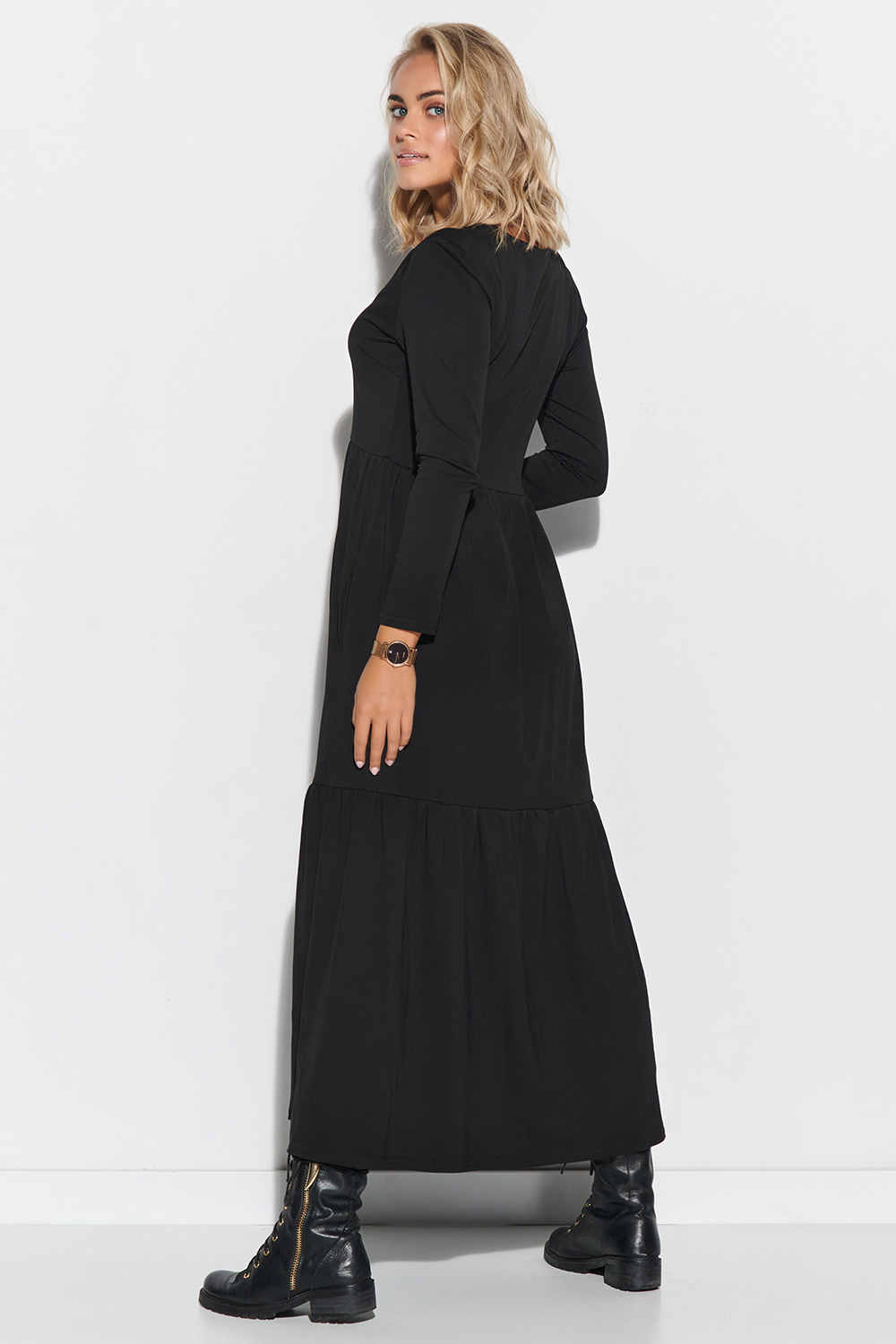 Women’s maxi dress, with long sleeves and a heart neckline. The dress is made of good quality single-linen cotton, which is ideal for almost any season. The dress is long, and despite its simple cut, it makes an amazing impression. The heart neckline elongates the neck and emphasizes the cleavage, while the long sleeves slim the shoulders. The dress is cut off under the bust, which covers up imperfections in the stomach, thighs and buttocks. A decorative horizontal hem was applied to the bottom part. Model comes in two colors: black and khaki.