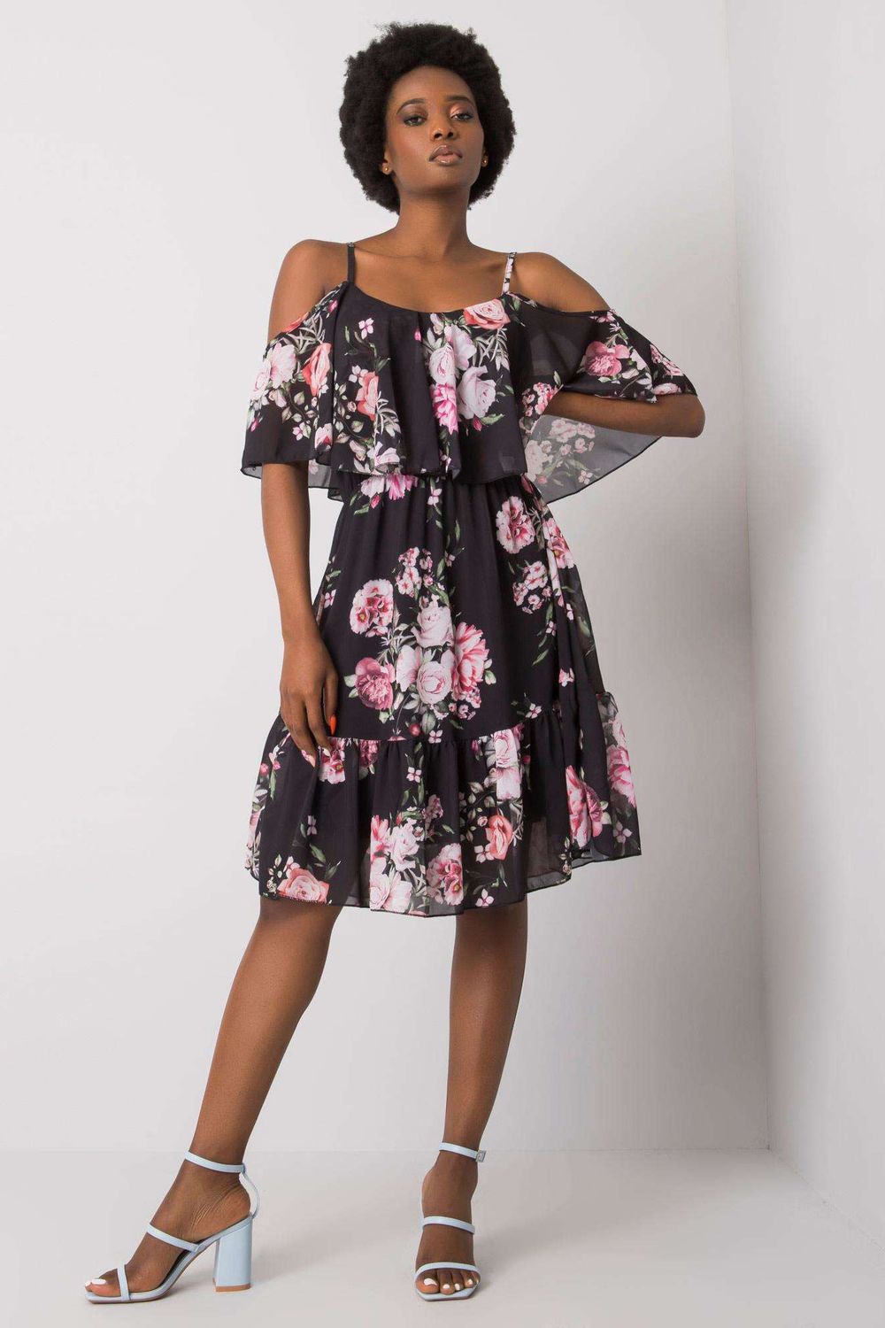 Floral fabric dress, strapless with short sleeves. Dress has a flared cut with a frill. Ideal for many occasions.