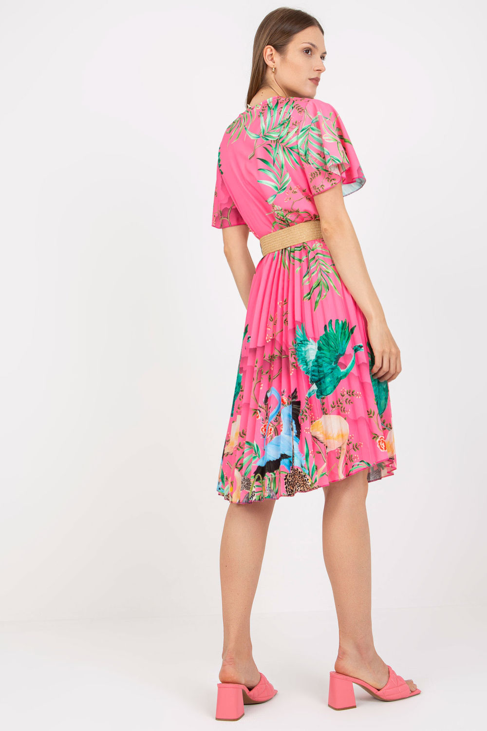 Summer dress with short sleeves, an envelope neckline and a flared bottom. Pleated dress bottom. Dress with a braided belt included. Ideal for many occasions.