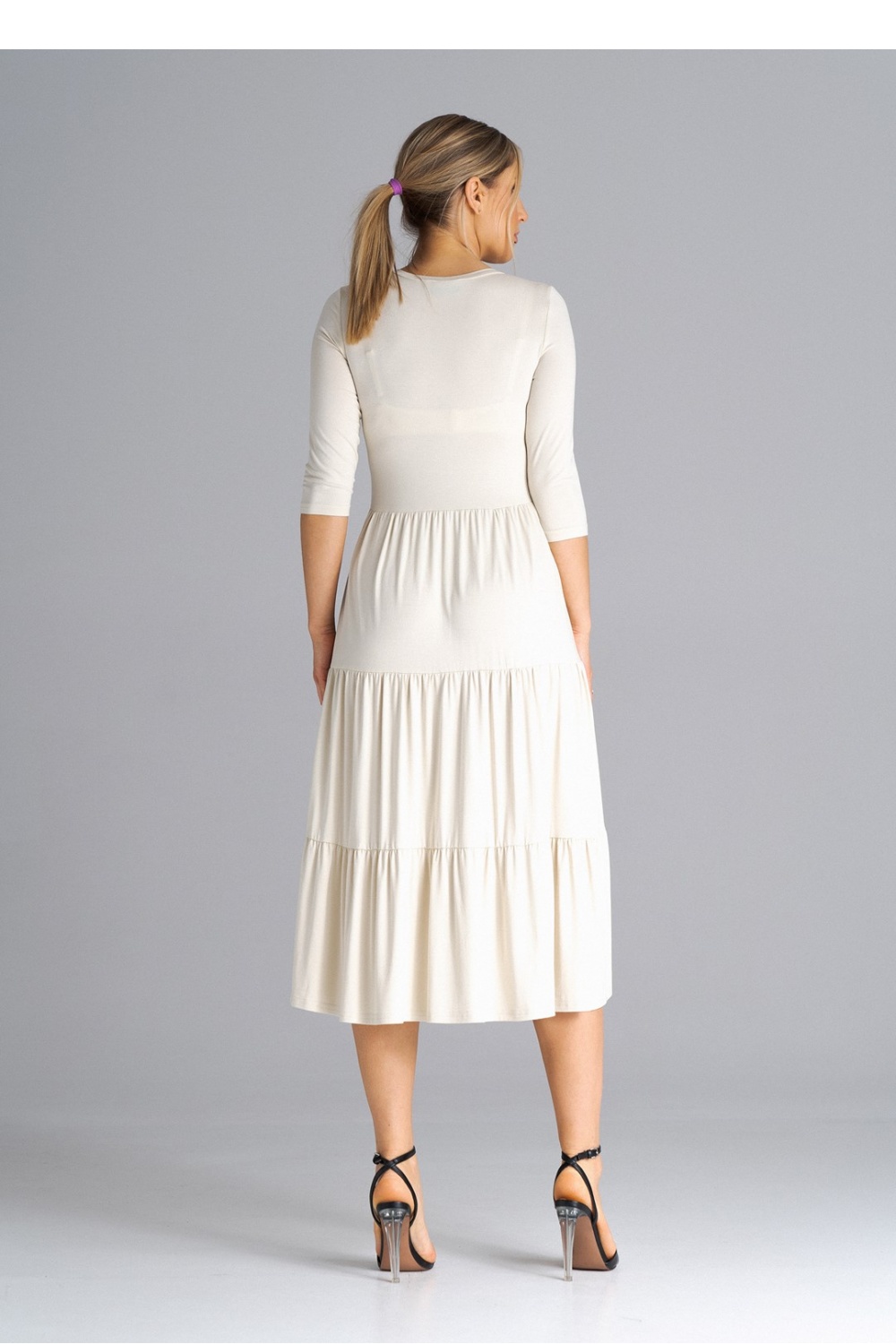 Midi dress with 3/4 sleeves, fitted at the waist.