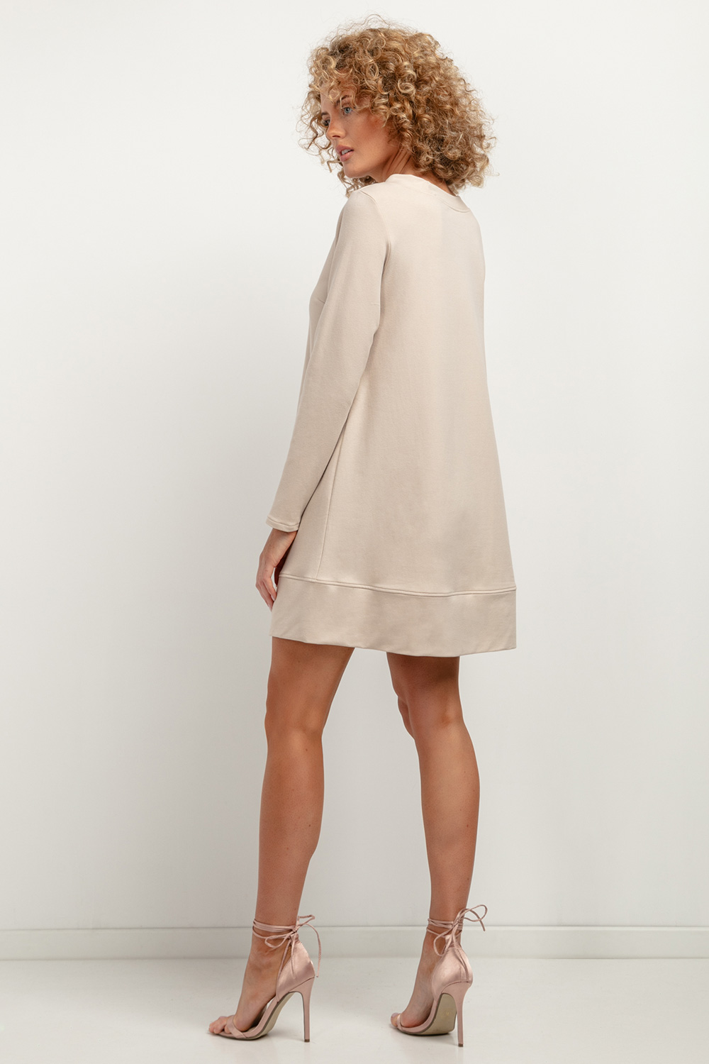 Knitted dress before the knee with trapezoidal cut is a great option for the autumn season. Careful finishing, a stand-up neckline, darts in the bust area, a hem at the edge of the sleeves and a decorative pleat at the bottom of the dress give the dress a unique style. A pleasing sweatshirt knit breaks up the elegant aesthetic, providing a nonchalant look and comfort. The dress is sewn from OEKO-TEX Standard 100 certified knit fabric.