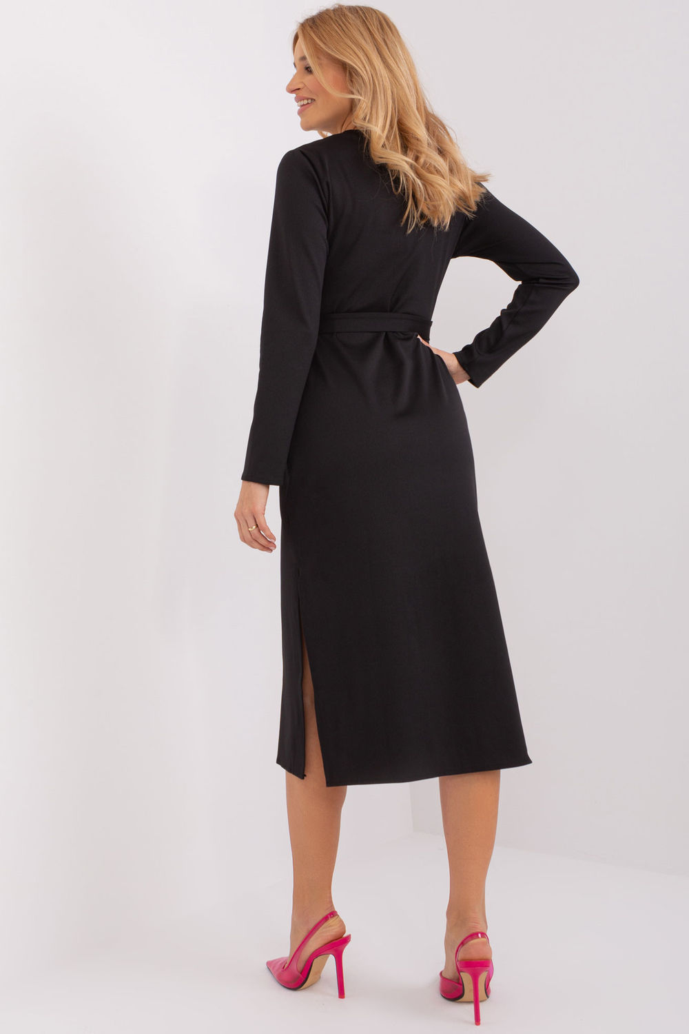 Dress with long sleeves and a heart neckline. Envelope neckline with decorative interlacing, to complete the dress has a tie belt. At the bottom sides seductive slits. The dress is made of ribbed material. A proposal ideal for many occasions.