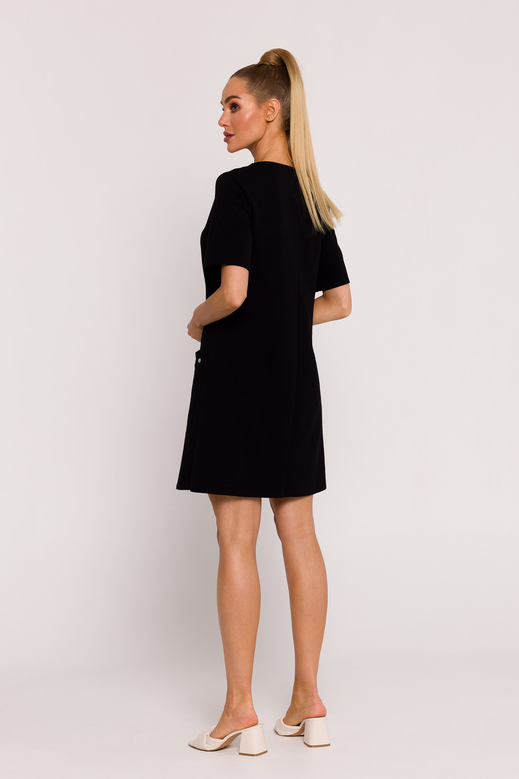 This knit dress is a unique product, designed and made with attention to detail in Poland, which emphasizes the high quality and style of Polish tailoring. The dress has an A-line cut, which gives it a lightness, while emphasizing the feminine silhouette. A subtle neckline adds delicacy to the dress, creating a harmonious balance between elegance and everyday comfort. Short sleeves make the dress ideal for warmer days, adding lightness to the whole look. Practical side pockets hidden in the seams on the front of the dress are not only functional, but also add nonchalance and urban character. A decorative logo-plated plaque placed on one of the pockets is an elegant decorative element, emphasizing the uniqueness of the dress. It is worth noting that the dress has no lining, making it light and airy, perfect for summer days. This garment not only emphasizes Polish design and tailoring tradition, but also combines functionality, comfort and fashionable style. This dress is an excellent choice for women who are looking for a unique piece of clothing, perfect for both everyday wear and special occasions.