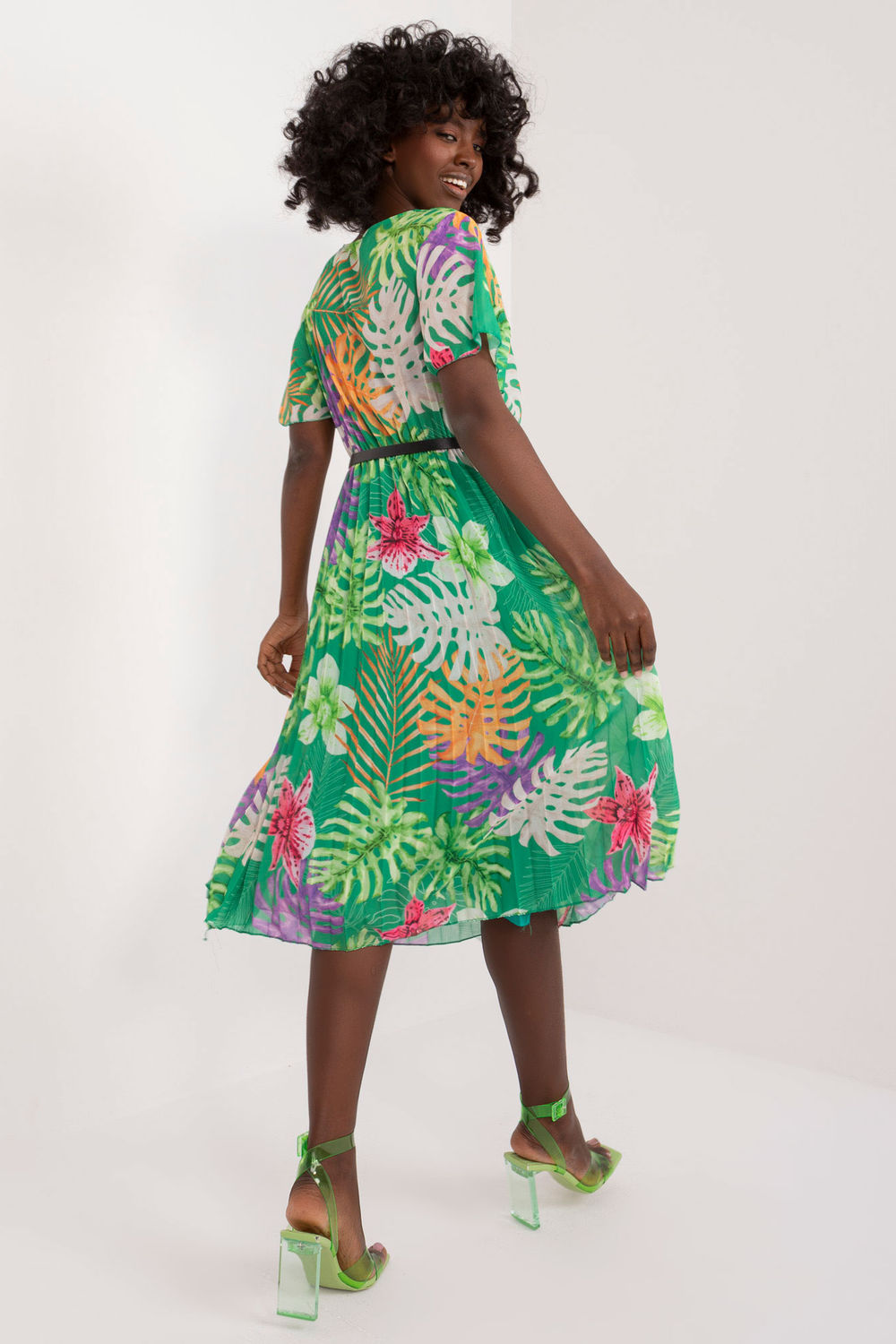This dress is the quintessence of everyday elegance that will make every day special. Its blushed cut provides freedom of movement, while emphasizing the feminine silhouette. The lower part of the dress is decorated with pleats, adding lightness and delicacy to the whole style. Made of polyester, this dress not only looks great, but is also easy to care for and pleasant to wear. Its midi length makes it suitable for many occasions, from walks around town to meetings with friends. The short sleeves make it comfortable to wear even on warmer days, while the envelope neckline adds subtle charm and a feminine touch to the dress. The dress features a buckled belt that accentuates the waist and adds proportion to the silhouette. With a lining for extra comfort, this dress is a combination of style, comfort and elegance that will make you feel confident and beautiful every day. Perfect for everyday outings, this dress will quickly become a favorite in your closet.