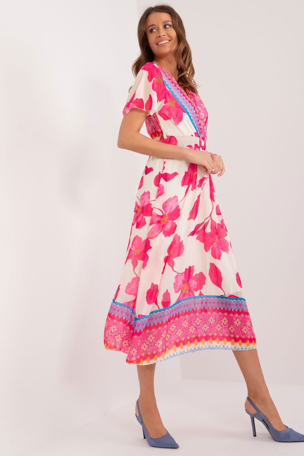 Summer dress with short sleeves in the form of frills. Dress with lining. Envelope neckline, belt fastened at the waist, pleated bottom. An ideal choice for many occasions.