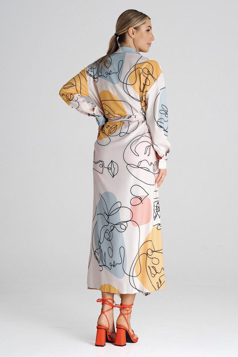 Maxi shirt dress with a collar. Decorative flaps on the bust line. Long sleeves finished with buttoned cuffs. Button-up dress, tied at the waist. Side slits. Dress without pockets and lining.