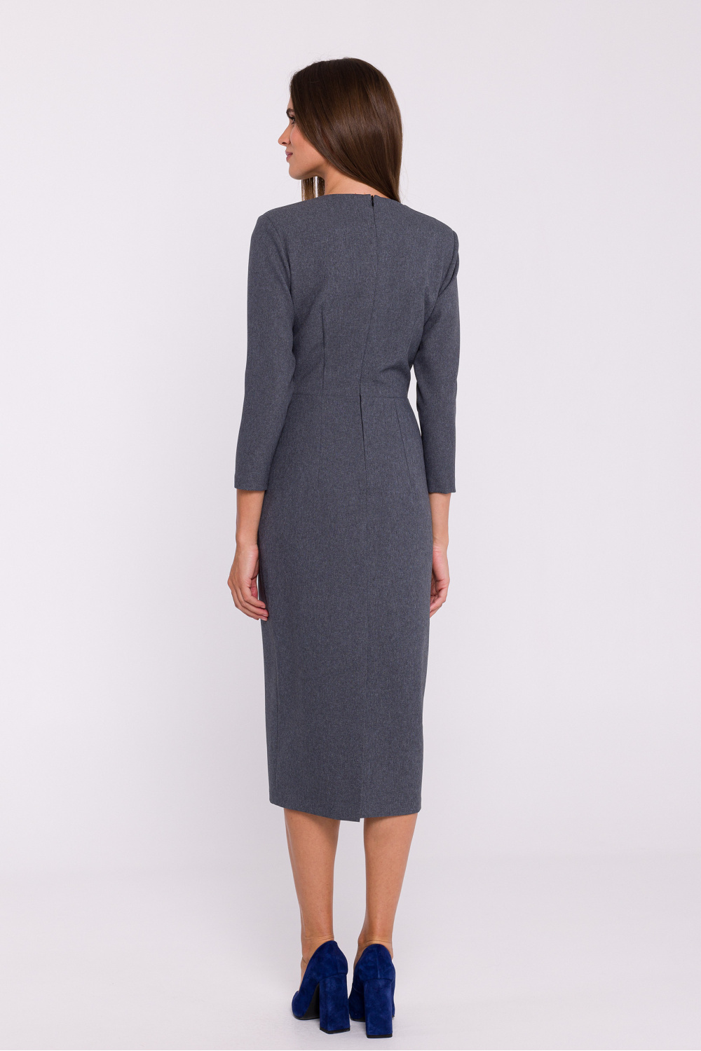 Elegant dress made of fabric with a simple pencil cut, cut off at the waist, which subtly emphasizes the silhouette. The V-shaped neckline adds a chic touch and optically slims the neckline. The midi length provides a classic look, perfect for both formal and casual occasions. The dress is equipped with a covered zipper on the side and a lining, ensuring comfort and a perfect fit. An additional decorative touch is the attached flower on the chest, which adds to its originality. Designed and sewn in Poland, it is an excellent choice for women who appreciate style and elegance.