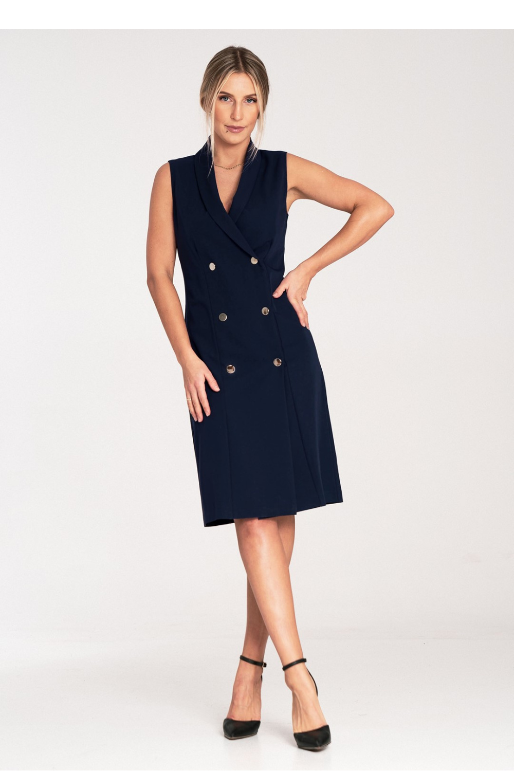 Elegant sleeveless midi dress. Narrow lapels at the front, envelope neckline, double-breasted closure with large decorative snaps. The dress is slightly flared to the bottom.