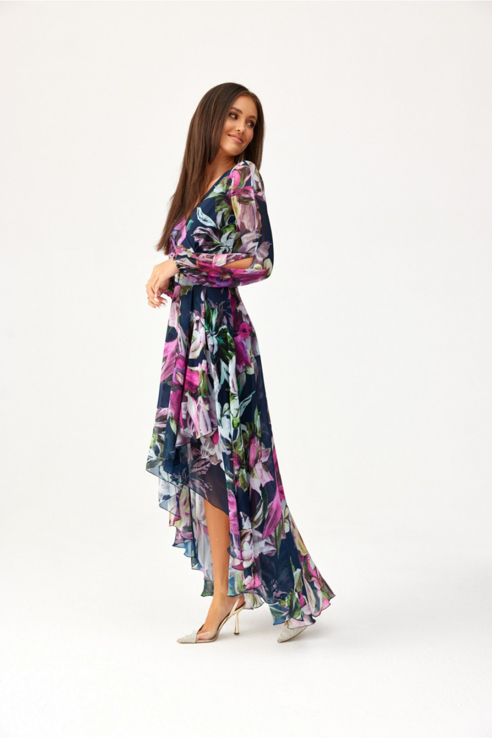 Asymmetric maxi dress. Flared bottom, top with a wrap neckline and amazing long puffed sleeves with decorative slits. Sleeves finished with elastic band. The dress narrowed at the waist will perfectly emphasize the waist area. Fastened at the back with a zipper with a delicate back exposure. The dress has a sewn-in slip, so the material will not be see-through. Just add delicate jewelry and you will dazzle everyone around you. The cut and length will be perfect for every figure, giving lightness to the silhouette and adding visually a few centimeters in length. The flowing and delicate material will gently wave with every move you make, leaving an unforgettable impression. The product is manufactured and sewn in Poland.