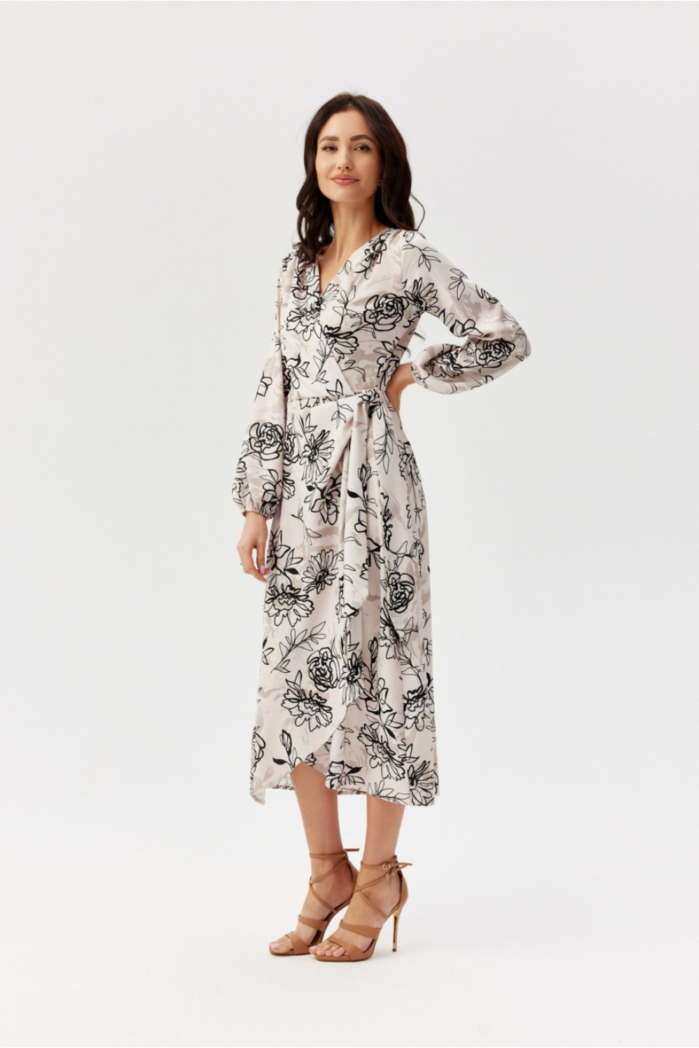 Midi dress with long sleeves. Wrap top and slightly flared bottom. It does not have a lining, with double tying at the waist.