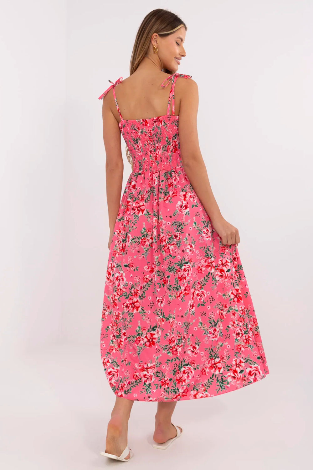Stylish and comfortable dress for everyday wear with a feminine, flared cut. Midi model with a rectangular neckline and tied straps that allow for a perfect fit and ensure wearing comfort. The corset waist beautifully accentuates the silhouette, and the sewn-in padded cups provide additional bust support, allowing the dress to be worn without a bra. Ruching at the back not only adds charm to the dress, but also increases flexibility and comfort. Button closure along the front adds a girly character and makes it easy to put on. The fashionable floral pattern makes the dress eye-catching and fits into the latest trends. Made of breathable material, a blend of polyester and elastane, which ensures freedom of movement and perfect body fit. A great option for everyday outings, meetings with friends, or casual summer strolls, whenever you want to look stylish but feel comfortable.