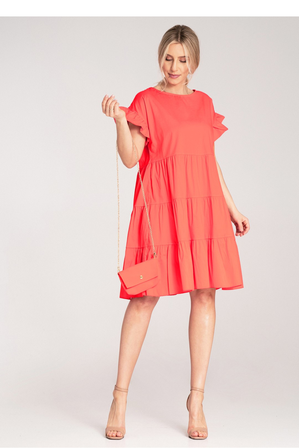 Mini dress with ruffles, made of light, cotton material. Loose-fitting model with short sleeves finished with a decorative ruffle. Flared bottom, with horizontal cuts adding volume. Comes with a small bag made of the same material, suspended on a golden chain.