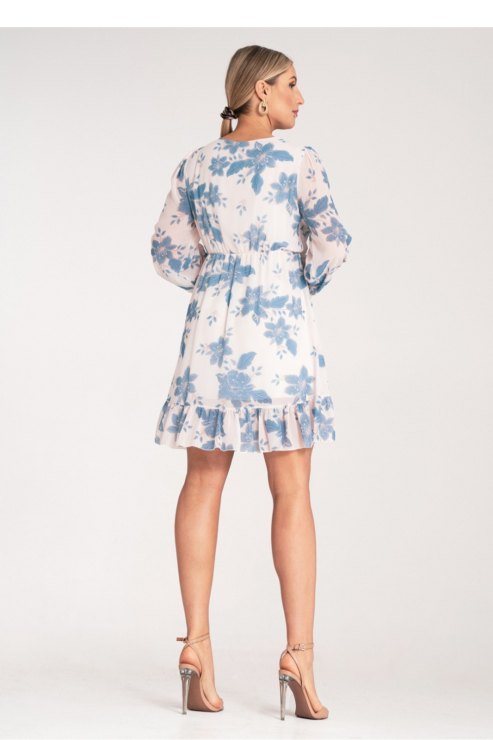 Flowy midi dress in a floral pattern with a wrap neckline and long sleeves buttoned up. The elastic waist accentuates the silhouette.