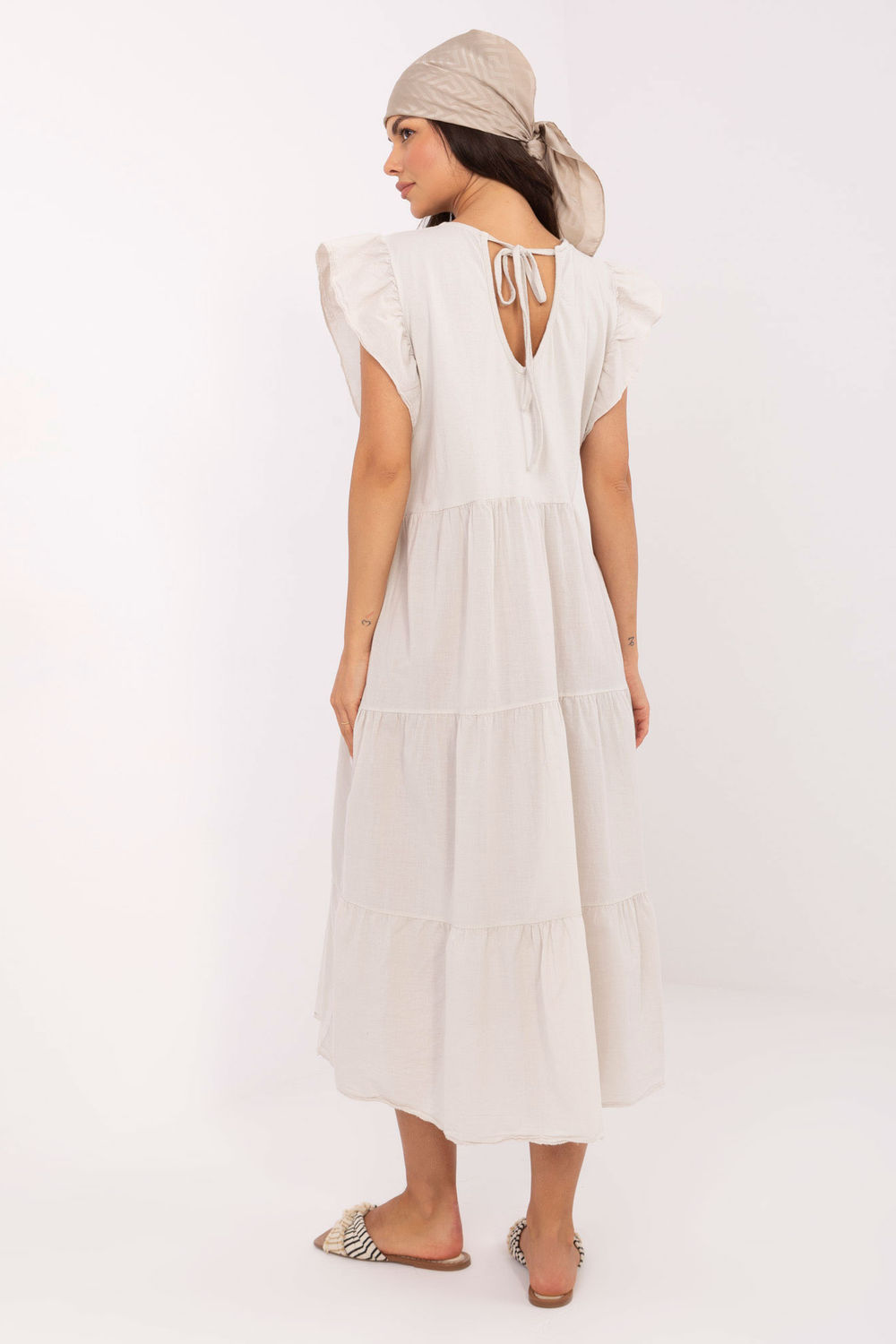 Loose, comfortable and stylish, this oversize cotton dress is the perfect choice for everyday summer outfits. Made of natural, breathable fabric, it ensures freedom of movement and comfort throughout the day. The midi-length model is made of smooth material, with a round neckline and short sleeves finished with a delicate frill that adds a feminine touch. The back of the dress is decorated with a subtle tie at the back, giving the whole a slightly romantic character. The dress will work great for everyday wear, for shopping, a walk, or a meeting with friends. Stylish in its simplicity, it will be an excellent base for many summer looks.