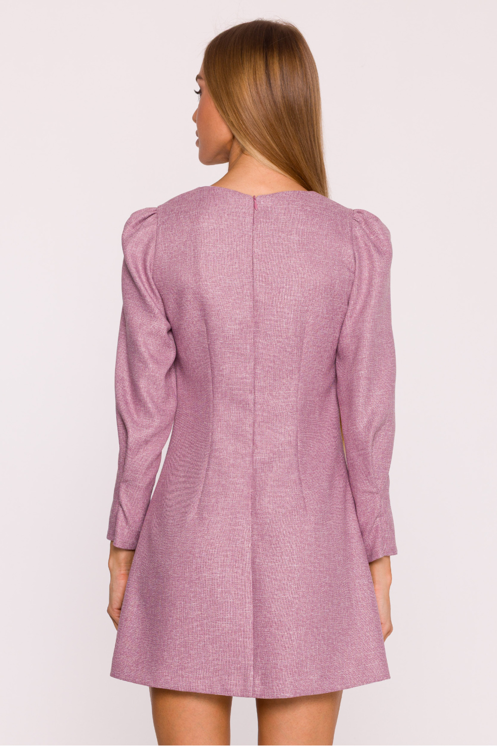 An elegant dress made of tweed fabric in a mélange pattern is a proposal that combines classic elegance with girlish charm. The structured material beautifully shapes the silhouette, and its characteristic texture gives the whole outfit a distinctive style. The model with a boat neckline and long sleeves gathered at the shoulders looks subtly and femininely. The seams at the bottom of the sleeves add an elegant form to them, and the concealed zipper at the back ensures comfort and aesthetic finish. Sewn-on pockets adorned with jewelery bows are placed on the front, breaking the classic line of the cut and introducing a spectacular, decorative accent. The trapezoidal cut, slightly fitted at the shoulders and loose at the hips, guarantees comfort and a beautiful, harmonious silhouette. The mini length gives the dress lightness and a modern character. Designed and made in Poland, perfect for women who appreciate elegance with a hint of original details.