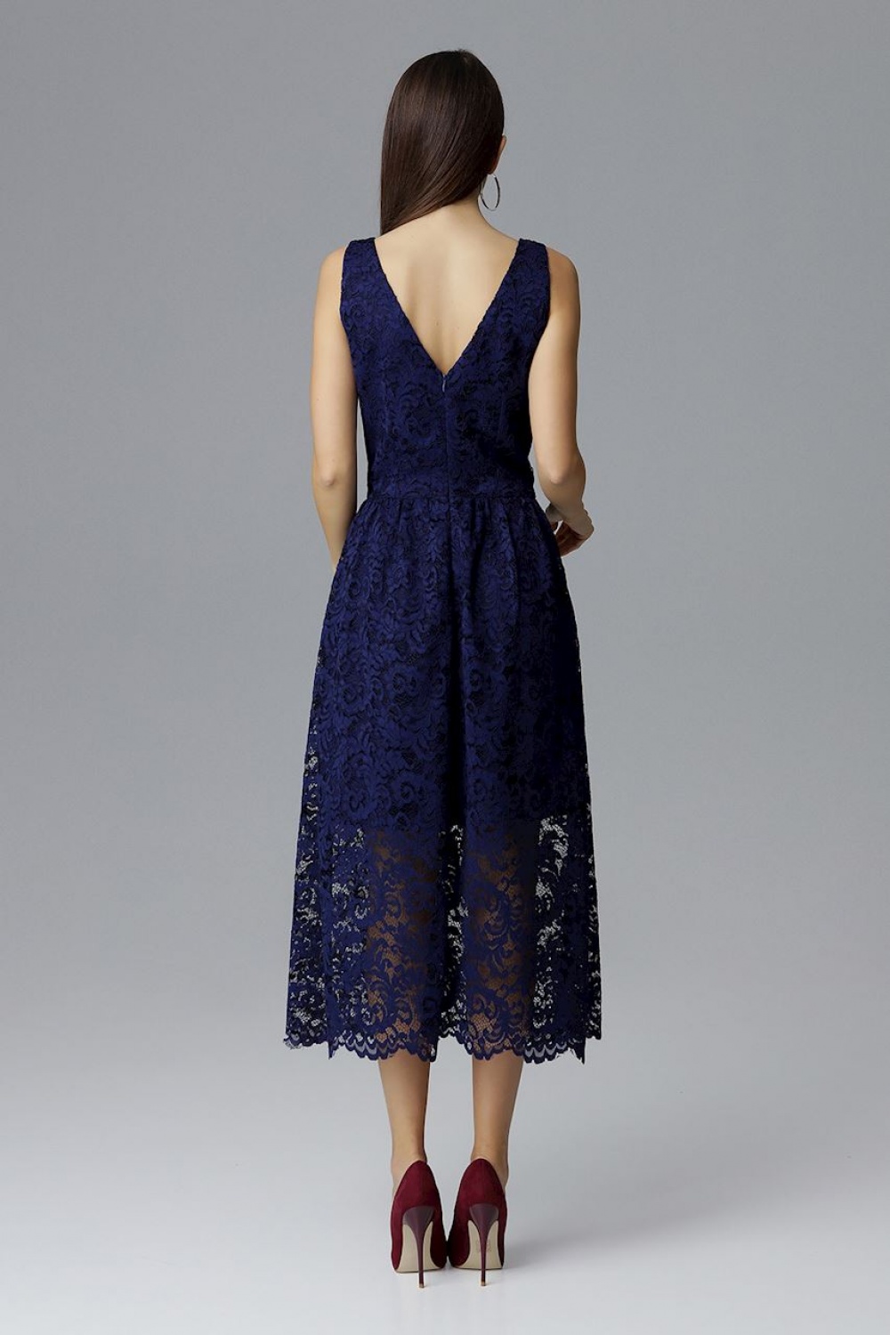 Elegant 7/8 length dress made of beautiful lace. Sleeveless model, top is fitted, bottom slightly creased, with lining. Beautiful neckline at the front and back emphasizes the unique character of the dress.