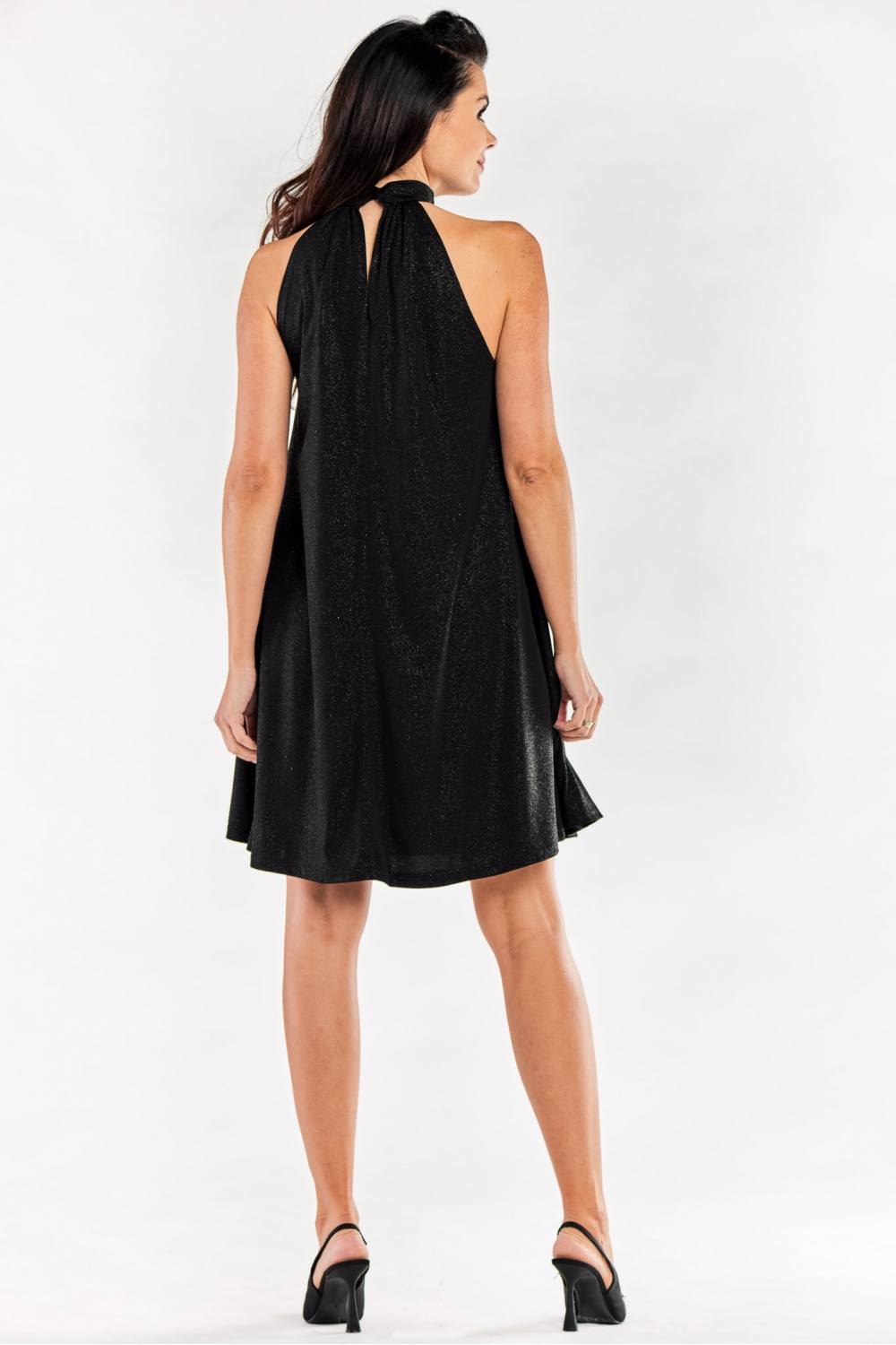 Short, flared dress with decorative neckline crease, on a buttoned collar. The dress is sewn on an elastic lining. The dress was manufactured in Poland.