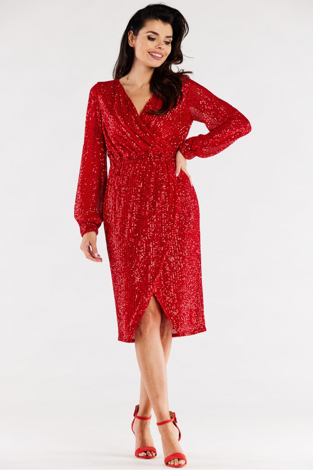 Sequined envelope dress with wider sleeves and a ruffle at the cuff. Wide elastic at the waist for a snug fit. The dress is sewn with elastic lining. The dress is made in Poland.
