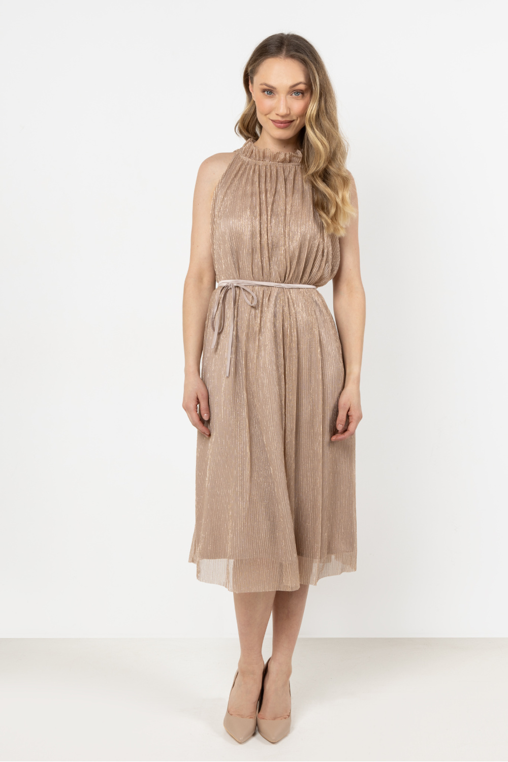 Elegance and modernity, this dress is the perfect choice for special occasions. The trapeze cut and exposed shoulders give it lightness, while the satin belt at the waist subtly emphasizes the silhouette. The halter neckline adds sophistication, and the satin lining ensures comfort while wearing. It will be perfect for elegant receptions and special ceremonies.