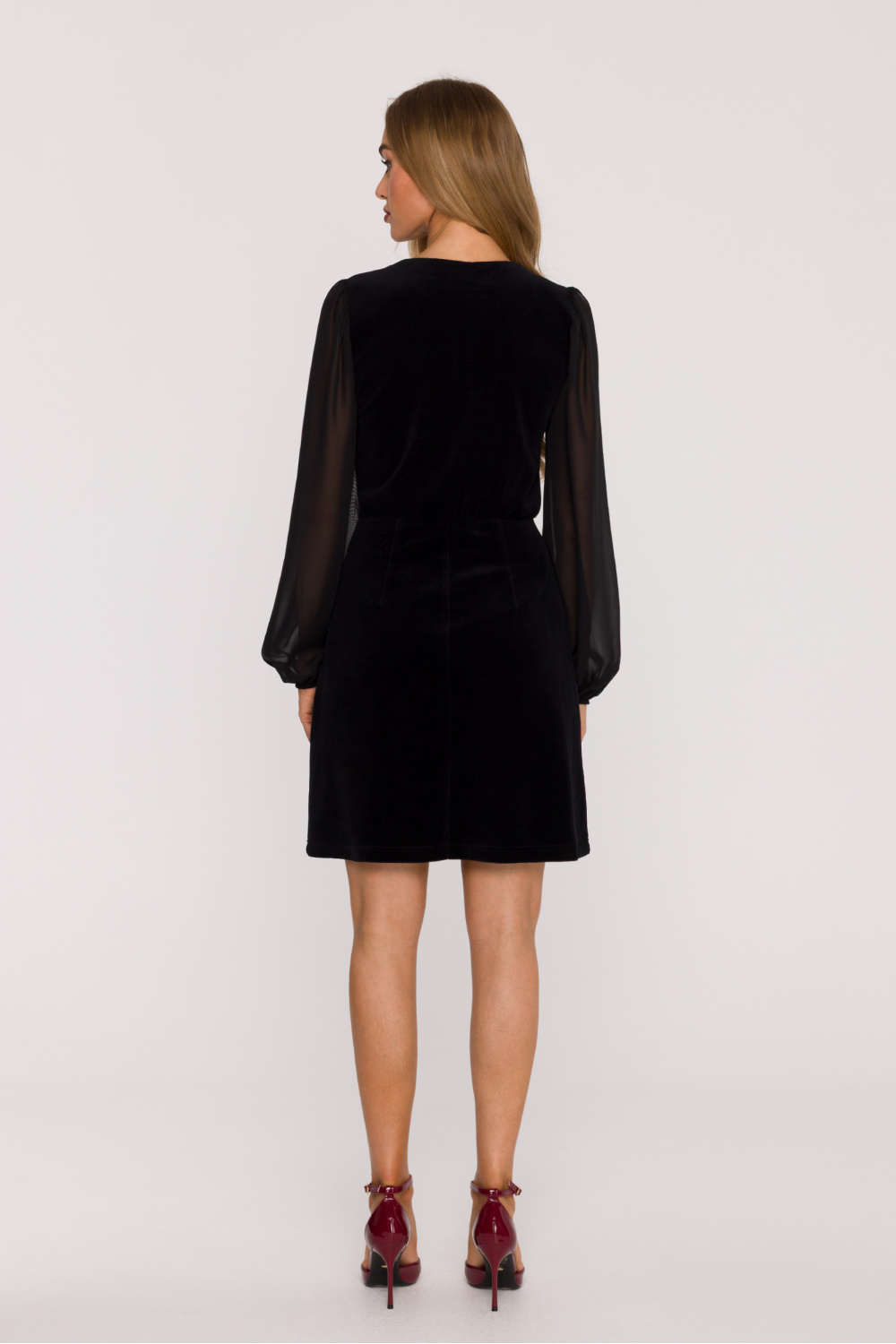 Stylish and feminine mini dress made of velvet, which impresses with the combination of two noble materials – soft, elastic velour fabric and transparent chiffon. It is a perfect combination of textures that adds elegance and subtle character to the whole outfit. The model has a round, classic neckline and long, puffy sleeves made of light chiffon, finished with a delicate elastic band, which beautifully drapes on the arms and adds lightness to the look. The dress has a fitted top and slightly flared bottom, creating a feminine, balanced silhouette. The covered zipper at the back makes it easy to put on and ensures a neat finish. The model does not have pockets or lining, making it light and comfortable to wear. The dress is designed and sewn in Poland with attention to every detail. It is a classic yet unique proposition that combines velvety elegance with chiffon delicacy, perfect for evening outings, ceremonies, and special occasions.
