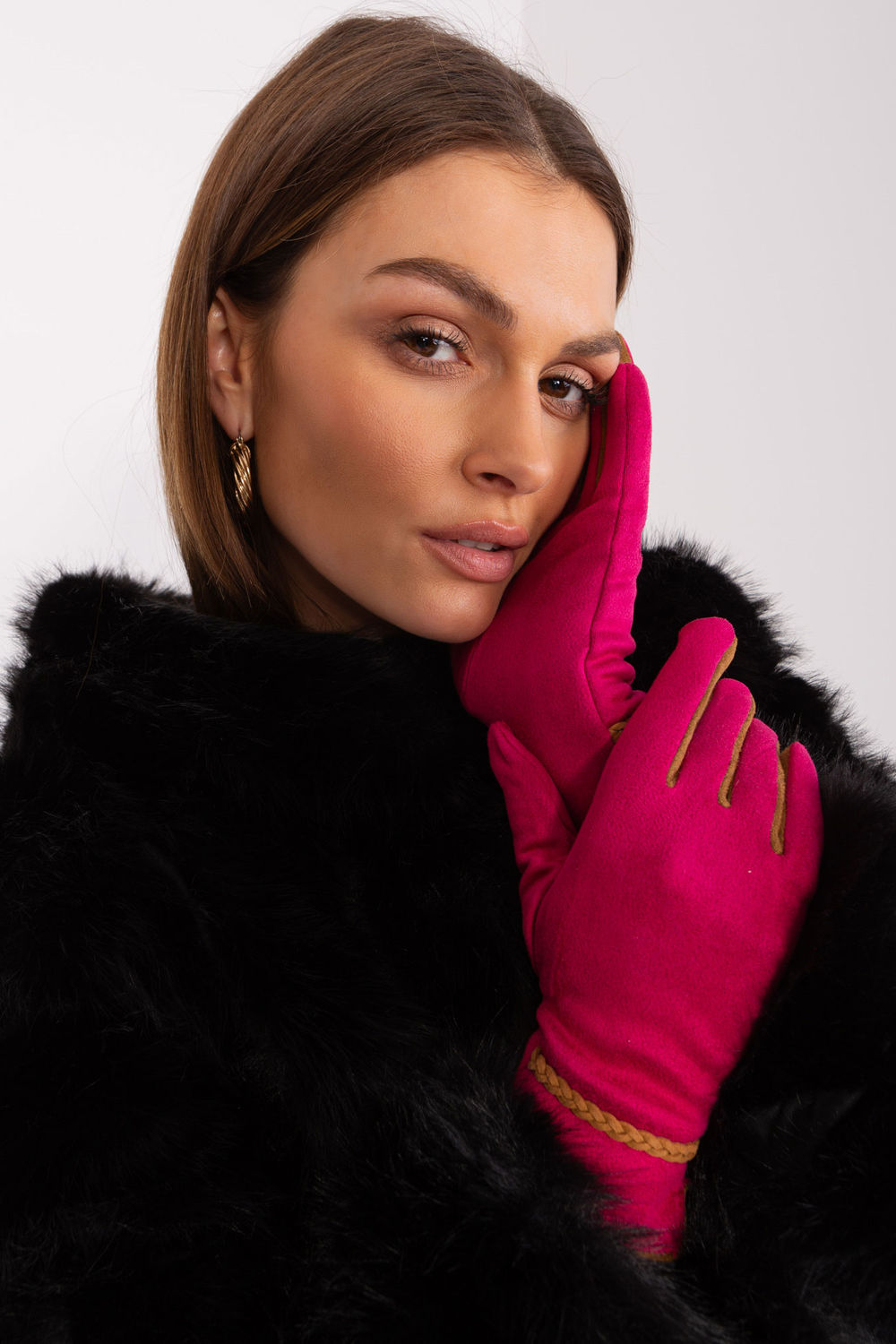 Elegant women’s gloves made of smooth material with contrasting inserts between the fingers. At the wrists decorative contrasting braided straps. Thumb and index finger with an embroidered flower, allowing you to operate the phone, without having to take off the gloves.