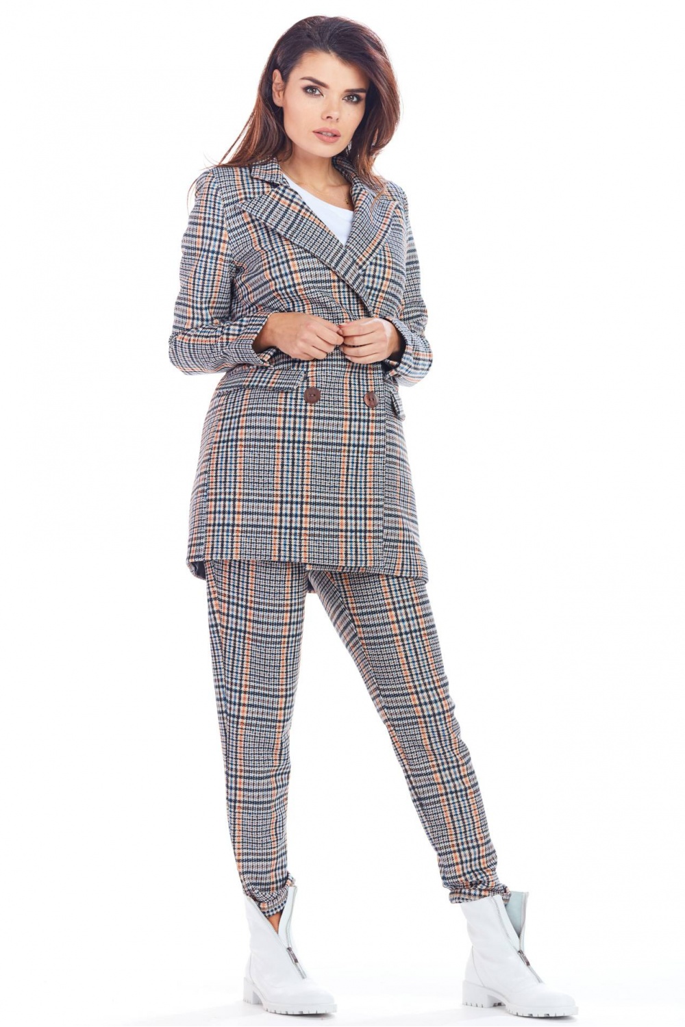 Loose-fitting jacket with straight sleeves and a double collar. It has a button closure and pockets. Made of fashionable checked fabric. It will match not only elegant but also casual outfits. Create a stylish suit with our A365 trousers. Available in two colours: navy blue and brown. Product designed and sewn in Poland.