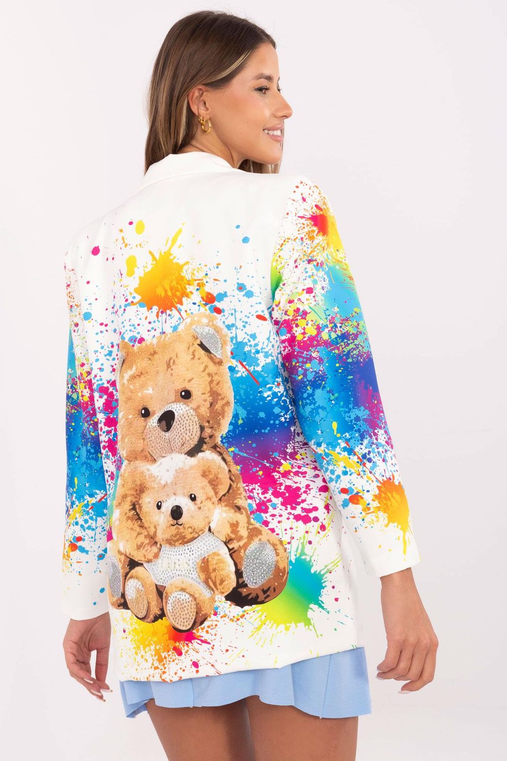 An elegant women’s blazer with a casual style, perfect for everyday wear, work, parties, and special occasions. Made of a lightweight blend of viscose and polyester, ideal for spring and summer. The colorful print gives it a modern and bold character, distinguishing it from classic models. The blazer has a standard length, long sleeves, and a single-button closure that emphasizes its elegant look. Shoulder pads give it a distinctive look and subtly shape the silhouette. Classic lapels and lining add a stylish finishing touch. Unlined, so it is great for warmer days. It is the perfect choice for women who want to combine elegance with modern design and comfort.