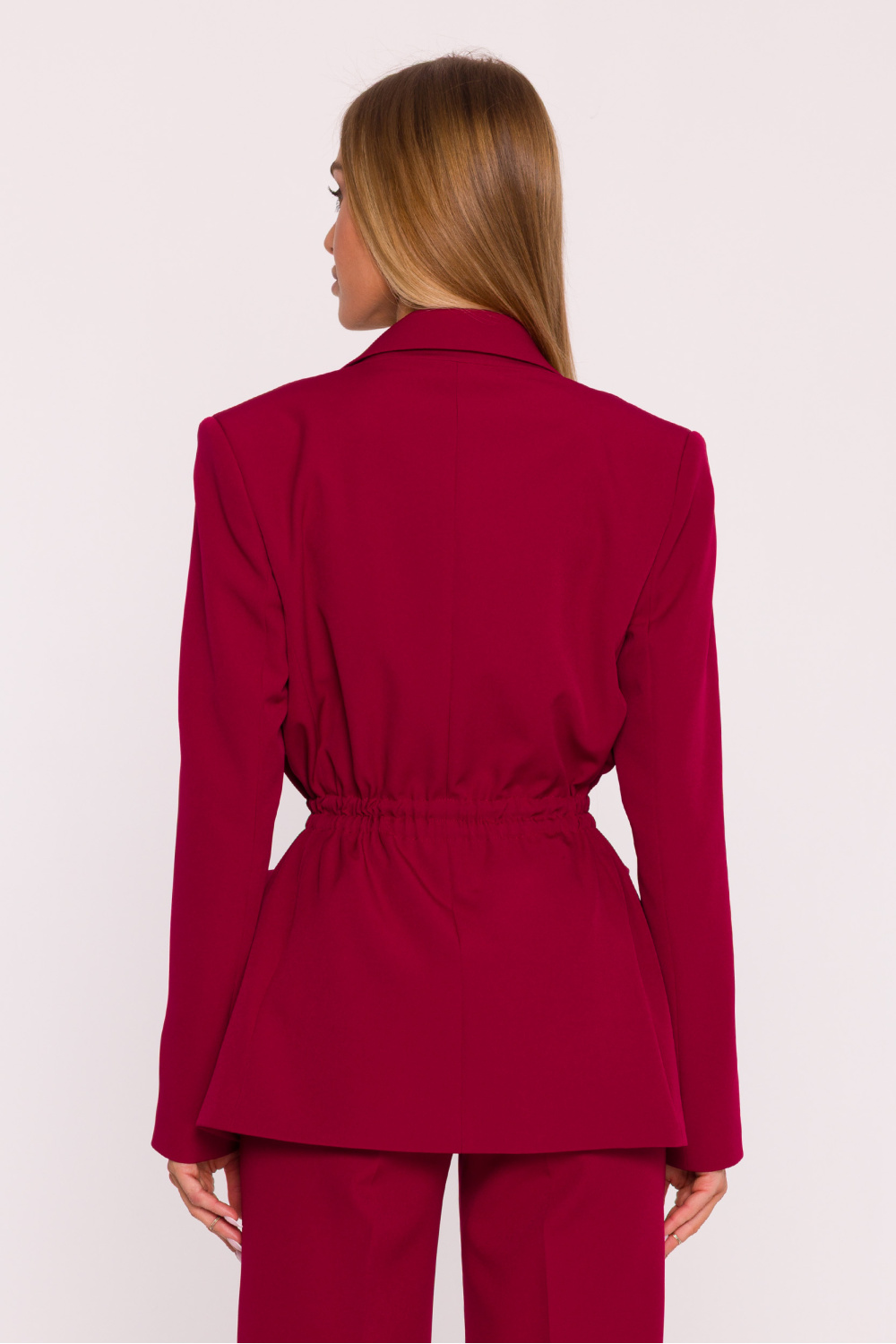 Stylish women’s blazer made of smooth fabric with a matte finish is a combination of classic style with modern functionality. The loose, oversized fit ensures freedom of movement, while the waist adjustment with metal-tipped drawstrings allows for a tailored fit, accentuating the feminine silhouette. The blazer features a classic collar with lapels and a single button closure, which, combined with the drawstrings, creates an elegant yet modern finish. The long, cuff-less sleeves and large patch pockets add practicality and a subtle, casual character. The blazer is fully lined for comfort and a perfect drape. With a simple cut and waist adjustment, this blazer pairs well with both elegant and everyday outfits. Designed and made in Poland, created for women who appreciate comfort, style, and modern details in a classic design.