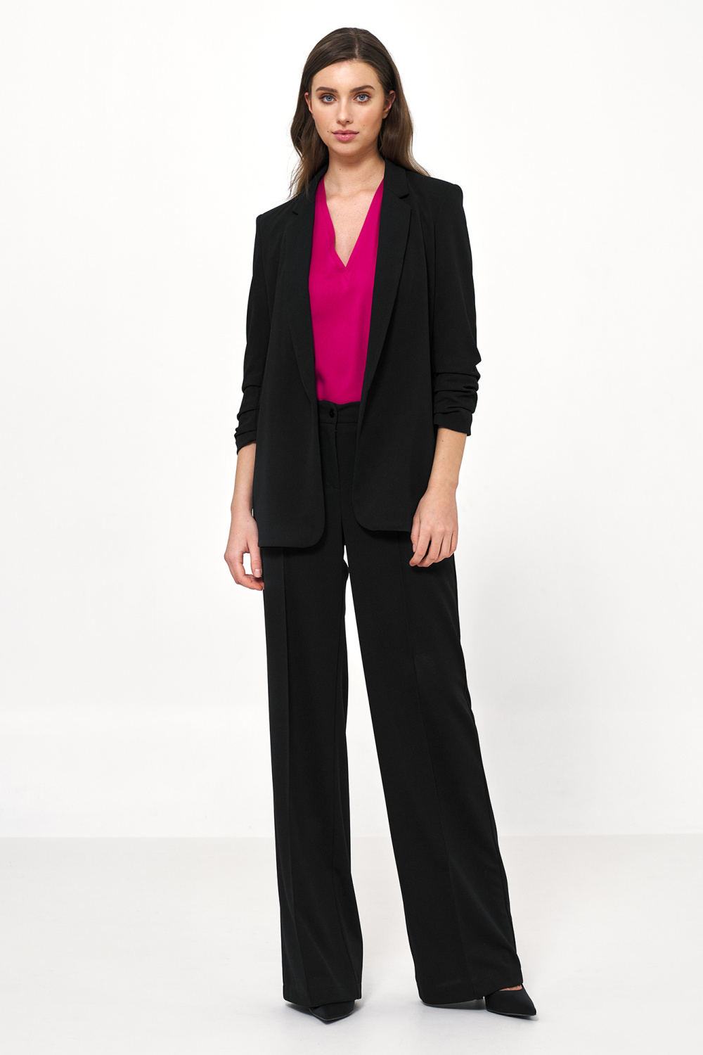 Comfortable and elegant jacket that fits perfectly in both casual and soft-office style. The jacket does not have a fastening, additionally the sleeves with pleating give it a unique look. We recommend this model in a classic color palette that will match most business and everyday outfits.