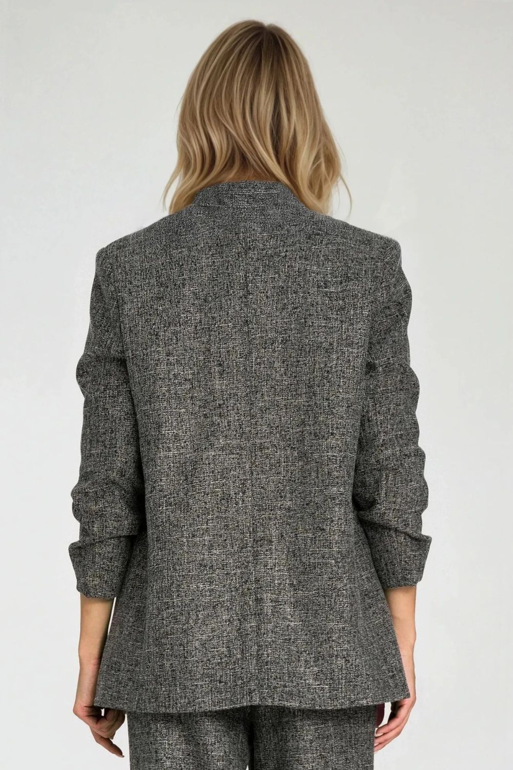 Stylish women’s blazer with a regular, loose cut, made of material with a mottled texture and uneven color, which gives it a modern character.