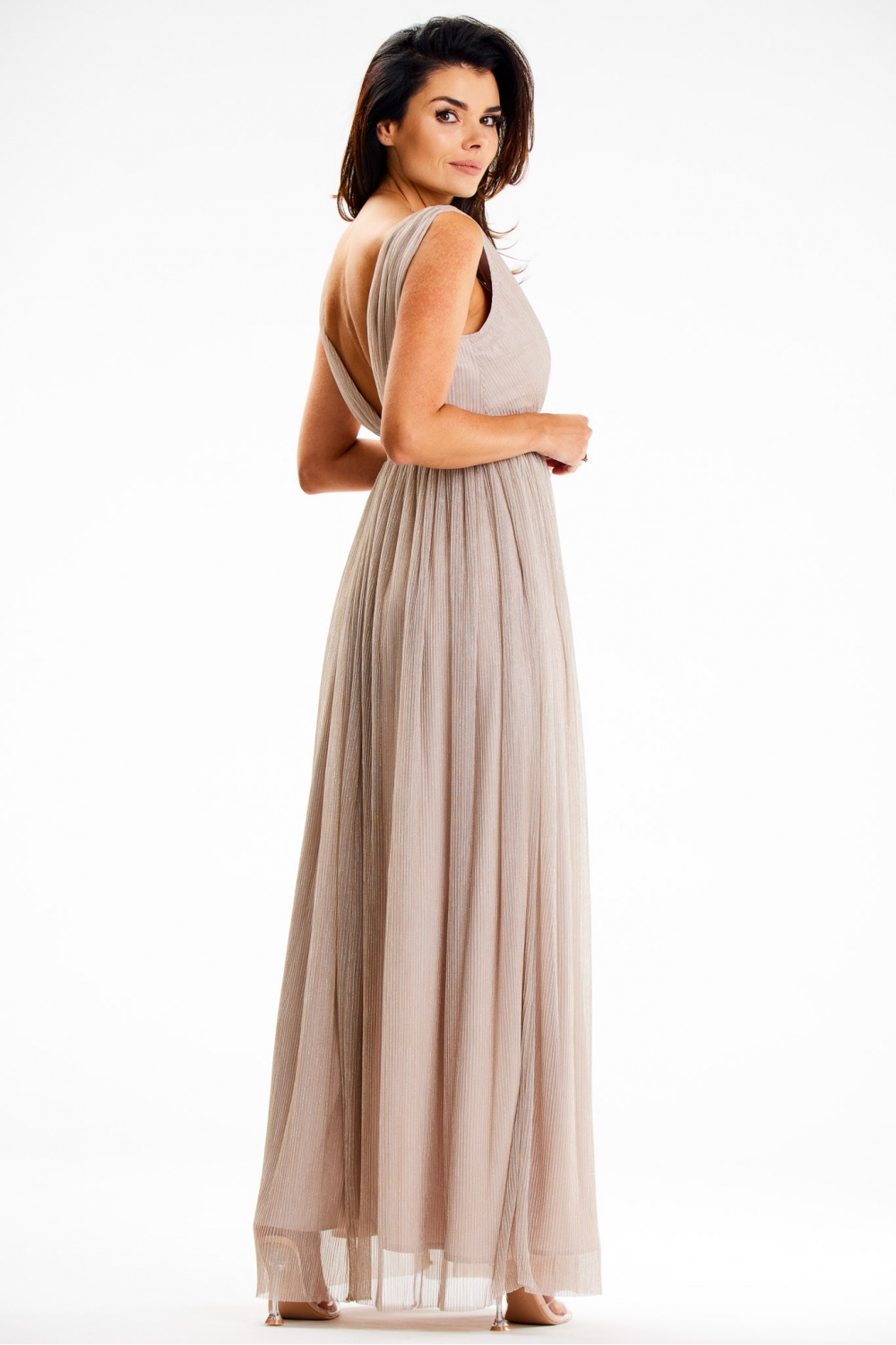 A unique maxi dress with a gently flared bottom and a front slit. The top of the dress in envelope style presents a large neckline on the back, which gives the whole dress a unique charm. Made of shiny mesh, supported by a satin lining. Perfect for evening outings.