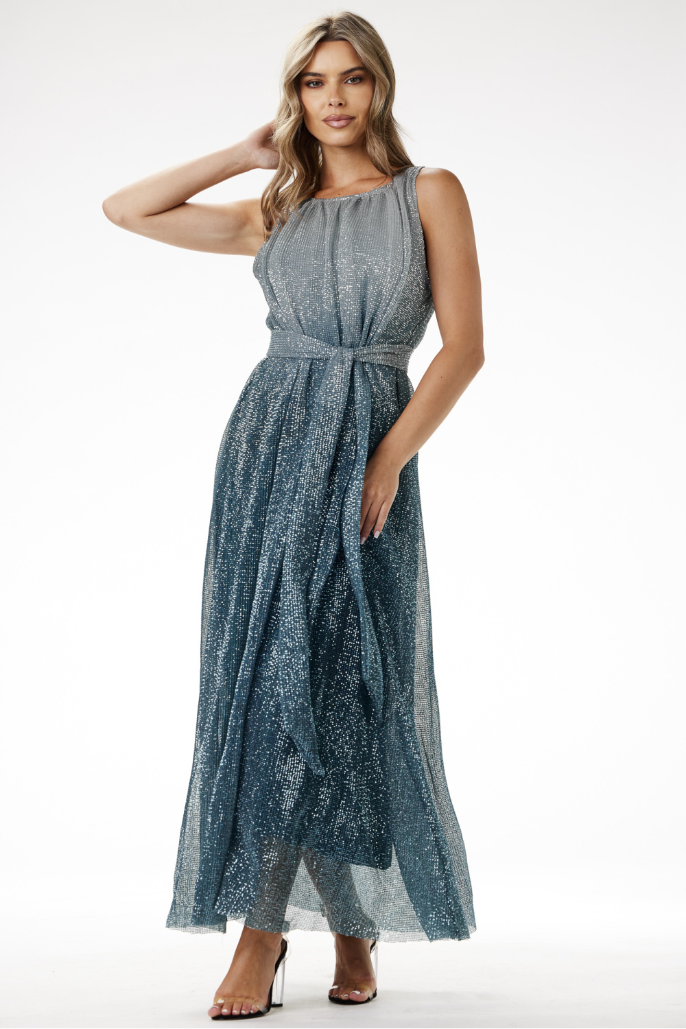 Elegant evening maxi dress with ombre effect. Phenomenal sequin knit maxi evening dress with a unique ombre effect, going from light gray to deep blue. Perfect for elegant celebrations and special evenings. The ombre effect and shimmering sequins add a unique sparkle to the dress, perfect for New Year’s Eve, weddings or elegant parties. The fitted cut with a belt accentuates the silhouette, and the satin lining ensures comfort. Choose this dress to dazzle everyone with your styling.