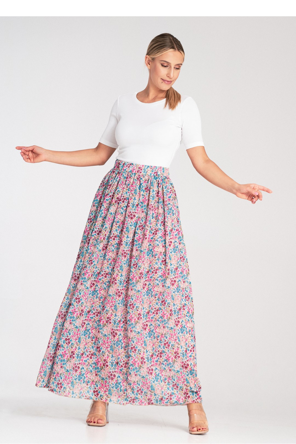 Elegant long, flared skirt made of striking fabric. Crinkled at the waist. Lined with 100% viscose.