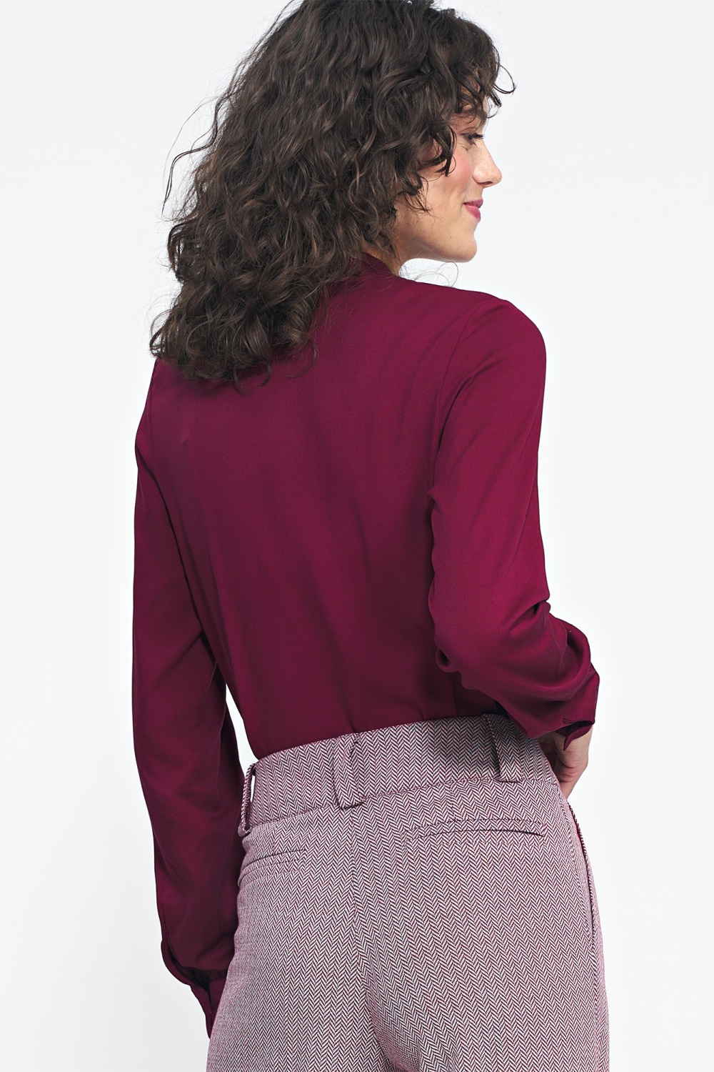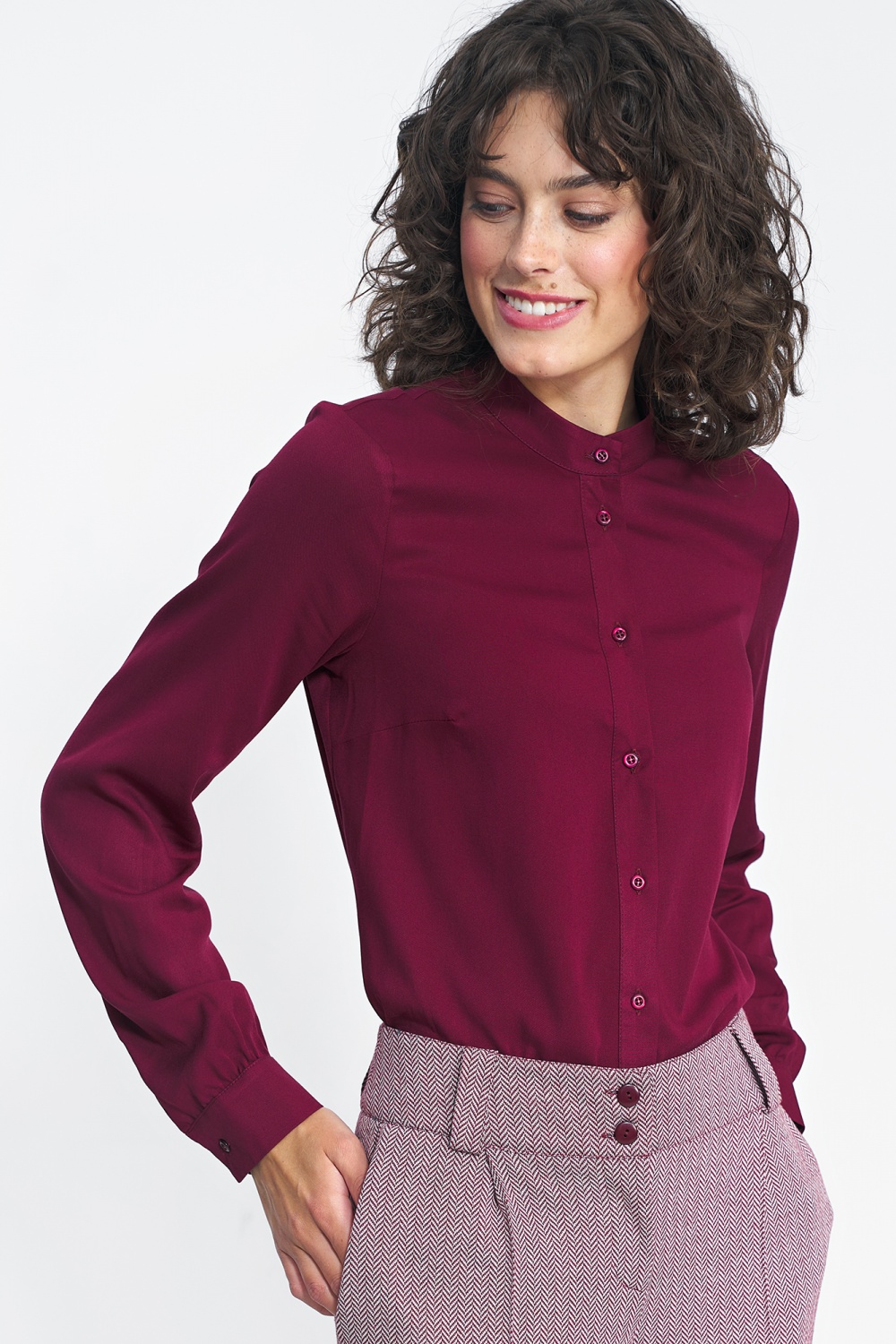 One of our first autumn proposals, this is a plain cut shirt with long sleeves, which are finished with cuffs and the neckline with a stand-up collar. It will go well with suit sets in different colors, it is the perfect base for business styling. An additional advantage is the 100% viscose material, which will make you feel comfortable all day long.