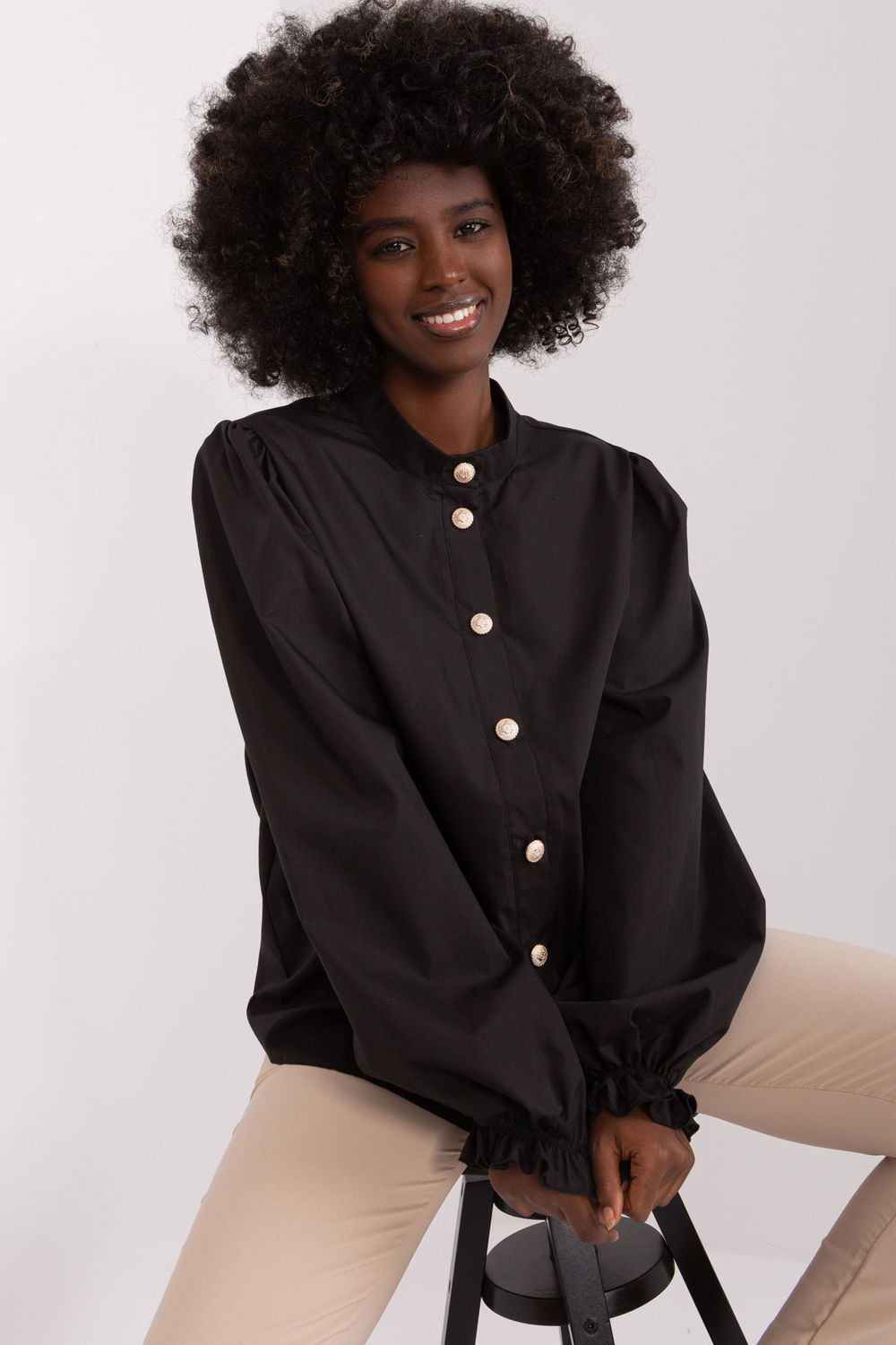 Women’s shirt with long buff sleeves and a stand-up collar. The sleeves are finished with a charming frill. The shirt is fastened with decorative buttons. A proposal ideal for many occasions.