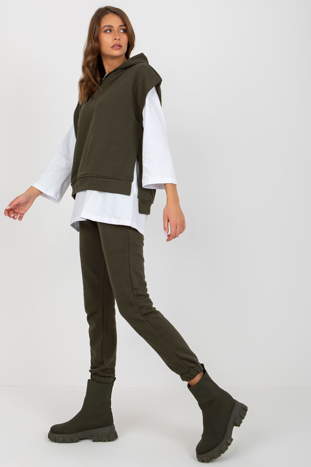 Sweatsuit set consisting of a blouse, sweatshirt and pants. Blouse with 3/4 sleeves and round neckline. Blouse with short sleeves and a hood. Long pants with a tie at the waist and slip pockets.