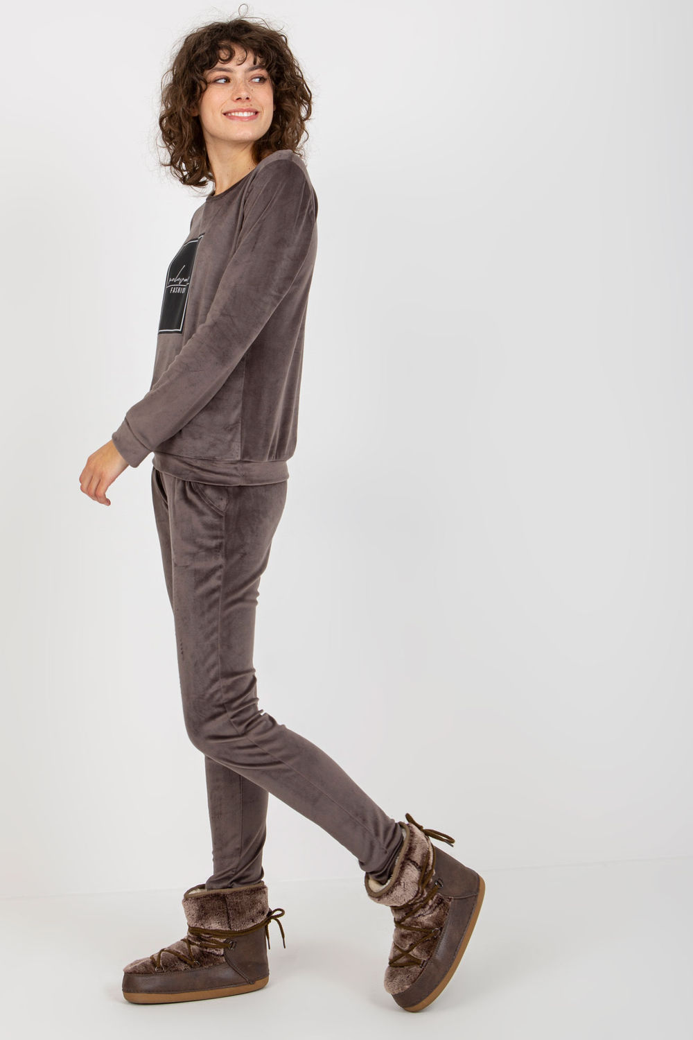 Velour tracksuit set consisting of a sweatshirt and pants. Sweatshirt tucked in over the head with long sleeves, decorative inscription on the front. Long pants with a tie at the waist and slip pockets.