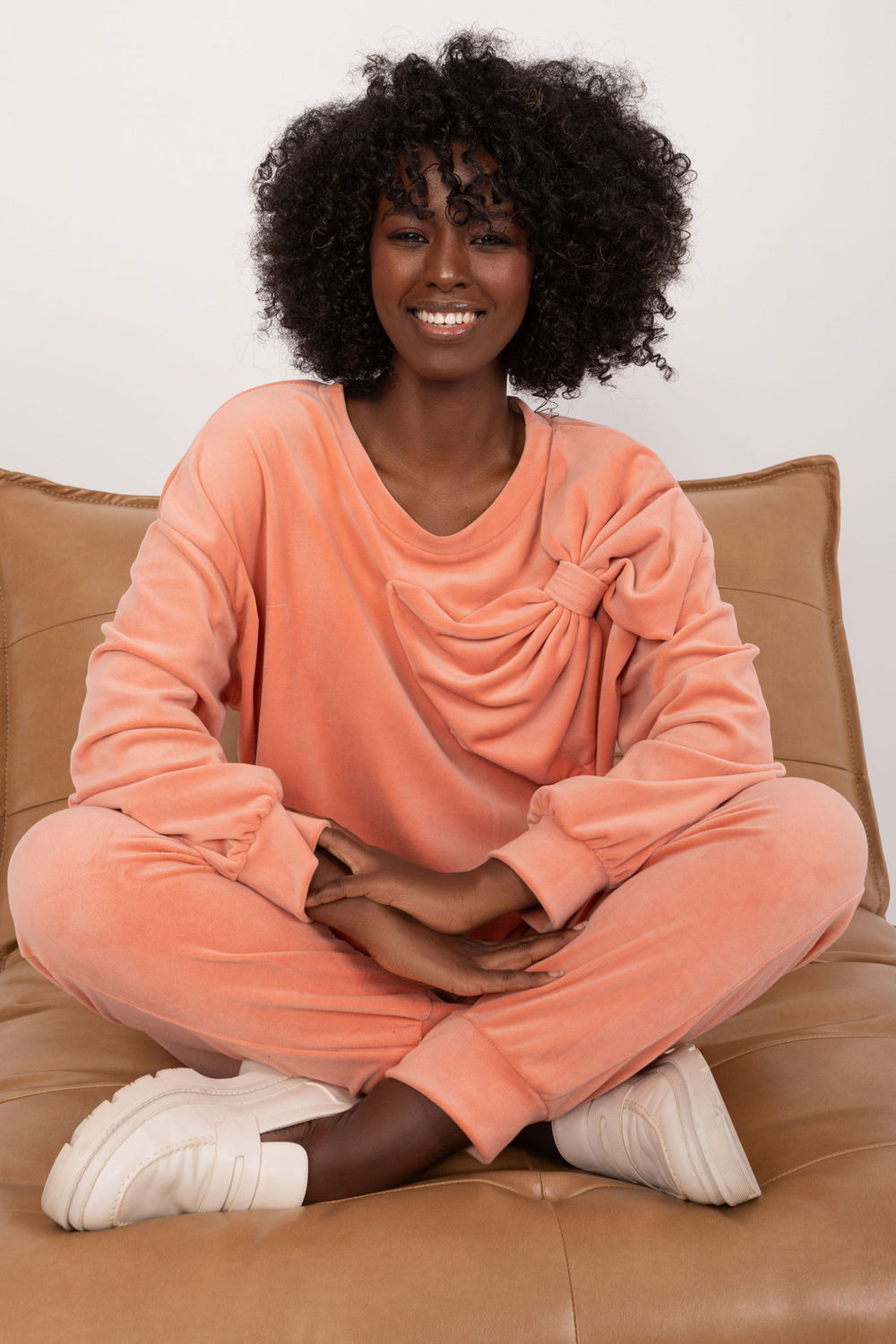 The velour sweatshirt and pants set is an excellent choice for those who appreciate the combination of comfort and casual style. Created for everyday activities, this set provides not only comfortable wear, but also a fashionable look. The dominant material is smooth polyester, which gives the set an elegant finish and makes it pleasant to wear against the skin. The standard length of the blouse and pants makes the set practical and versatile, ideal for various occasions. The legs of the pants are finished with drawstrings, which gives them a modern, slightly sporty look. The high rise of the pants emphasizes the silhouette and adds a fashionable touch. Side slip pockets in the pants are a practical feature for carrying small items. The blouse with long sleeves and round neckline is comfortable and suitable for everyday use. An additional decorative element in the form of a bow on the front of the blouse adds a subtle charm to the whole, making the set more attractive. This sweatshirt and pants set combines casual style with a modern comfortable fit, making it an ideal choice for an active day full of comfort and fashionable looks.