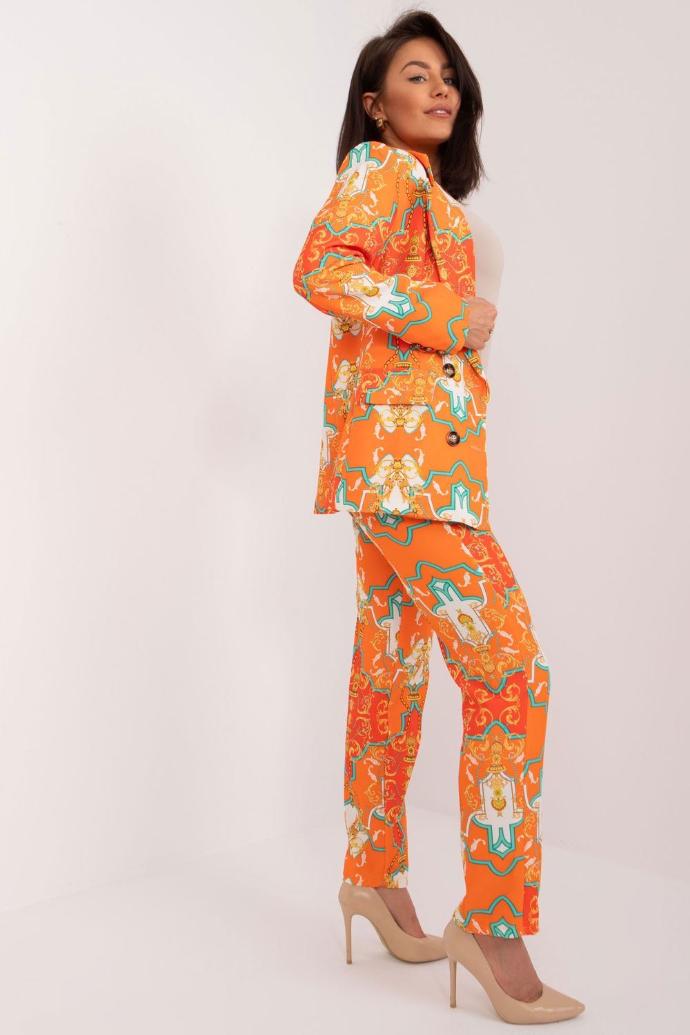 This elegant women’s set is ideal for a variety of occasions, from everyday wear at work to attending a party or business meeting. It consists of a long-sleeved jacket and long pants with a zipper and button closure. The jacket is made of high-quality material, which guarantees elegance and comfort in wear. It is buttoned, and the lapels add a classic touch. The jacket is lined for comfort and a better fit. The pants have straight legs and a high waist, which makes them not only stylish, but also comfortable and well-fitting. The zipper and button closure guarantee easy donning and durability. This set is decorated with a print, which adds originality and character. Thanks to its standard length and straight legs, it can be easily matched with various items of clothing, creating a variety of styles. As an added bonus, there are slip-in side pockets in the pants, which are practical and add utility to this set. With its high quality workmanship and elegant design, this women’s set is sure to be an excellent choice for many different occasions.