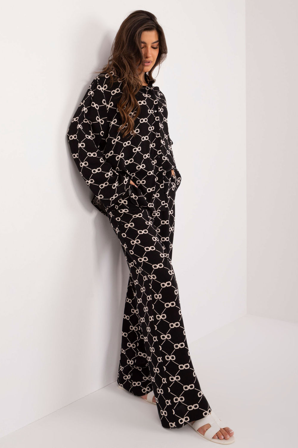 Discover a summer women’s set consisting of an elegant shirt and comfortable pants. This ensemble is the perfect choice for everyday outings, offering a combination of comfort and style. The stylish shirt buttons up, making it easy to put on and take off. It also features an additional waist tie that accentuates the silhouette and adds charm. The shirt has long sleeves, making it suitable for cooler days. The classic collar adds a formal touch to the shirt, balancing its casual style perfectly. The pants are equipped with a waist tie, allowing for a perfect fit to the silhouette. The straight legs make the pants versatile and suitable for various outfits. The high waist ensures comfort and highlights the waist. Practical, slip-in side pockets add functionality and convenience. The set is adorned with an original print that catches the eye and adds freshness to every outfit.